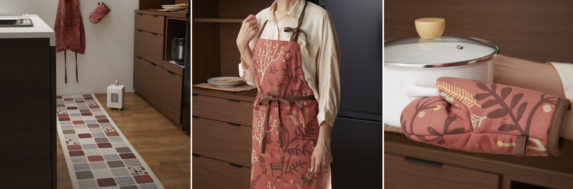 立ち仕事が疲れにくい厚手仕様で、お手入れもサッと拭くだけ。料理をより快適にしてくれます。北欧のナチュラルなぬくもりが感じられるエプロンとミトンで、見た目からもあたたかさを。