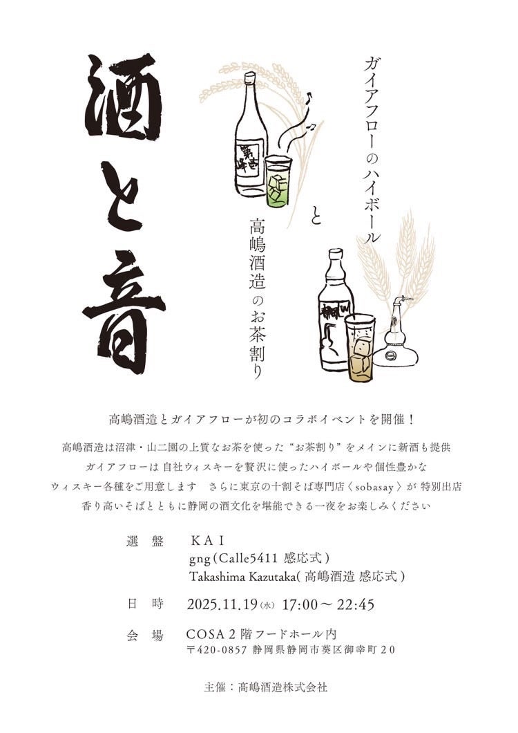 静岡県を代表する老舗酒蔵「高嶋酒造」と静岡らしさの詰まったこだわりのウイスキーを提供する「ガイアフロー」が初のコラボイベントを静岡駅前の複合施設cosaにて開催致します。