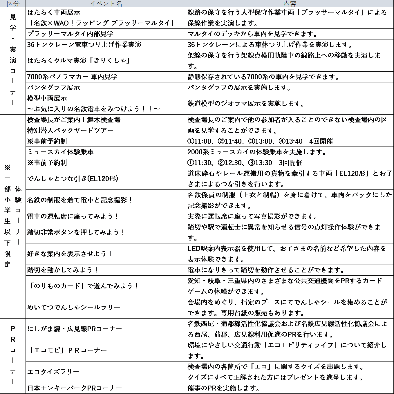 本イベントは、日頃から名鉄電車をご利用いただいているお客さまのご愛顧に感謝するとともに、多くのお子さまに名鉄ファンになっていただくことを目的に開催します。イベントでは、普段入場することができない舞木検査場内において、大型クレーンによる「電車つり上げ作業の実演」や「でんしゃとつな引き」等のプログラムを多数実施するほか、引退しても根強い人気を持つ「7000系パノラマカー」をはじめとする静態保存された往年の車両も間近でご覧いただけます。
