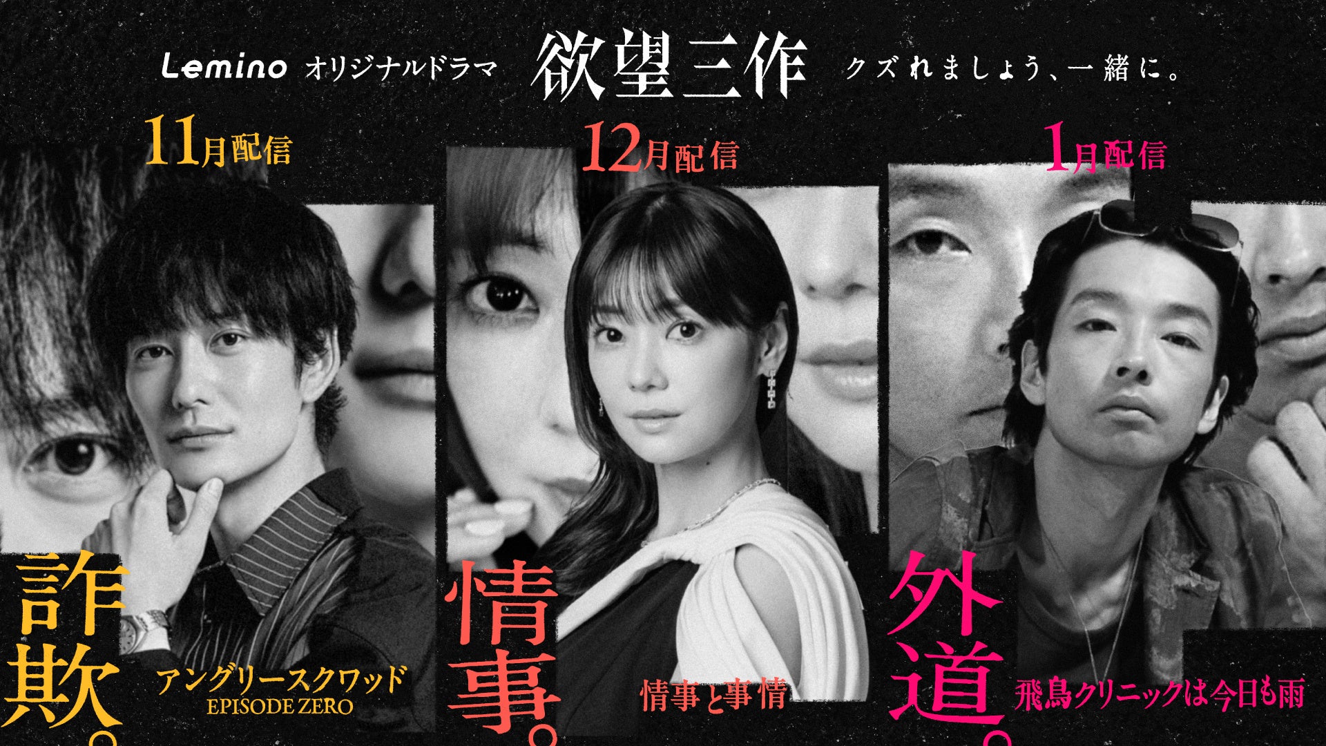 Leminoオリジナルドラマ「欲望三作」は、映画「カメラを止めるな!」の上田慎一郎監督が手掛け、マジメな税部署員と天才詐欺師が異色のタッグで脱税王から大金を騙し取る映画「アングリースクワッド 公務員と7人の詐欺師」の前日譚を描く『アングリースクワッド EPISODE ZERO』、「恋愛小説の名手」小手鞠るい氏原作による、大人たちの“情事と事情”が複雑に絡み合った恋愛群像劇『情事と事情』、 Xフォロワー84万人を超えるZ李氏が描く、新宿歌舞伎町で看板の無い何でも屋を営む主人公が、詐欺や未成年売春といった事件の真相に迫る『飛鳥クリニックは今日も雨』の三作でお送りいたします。