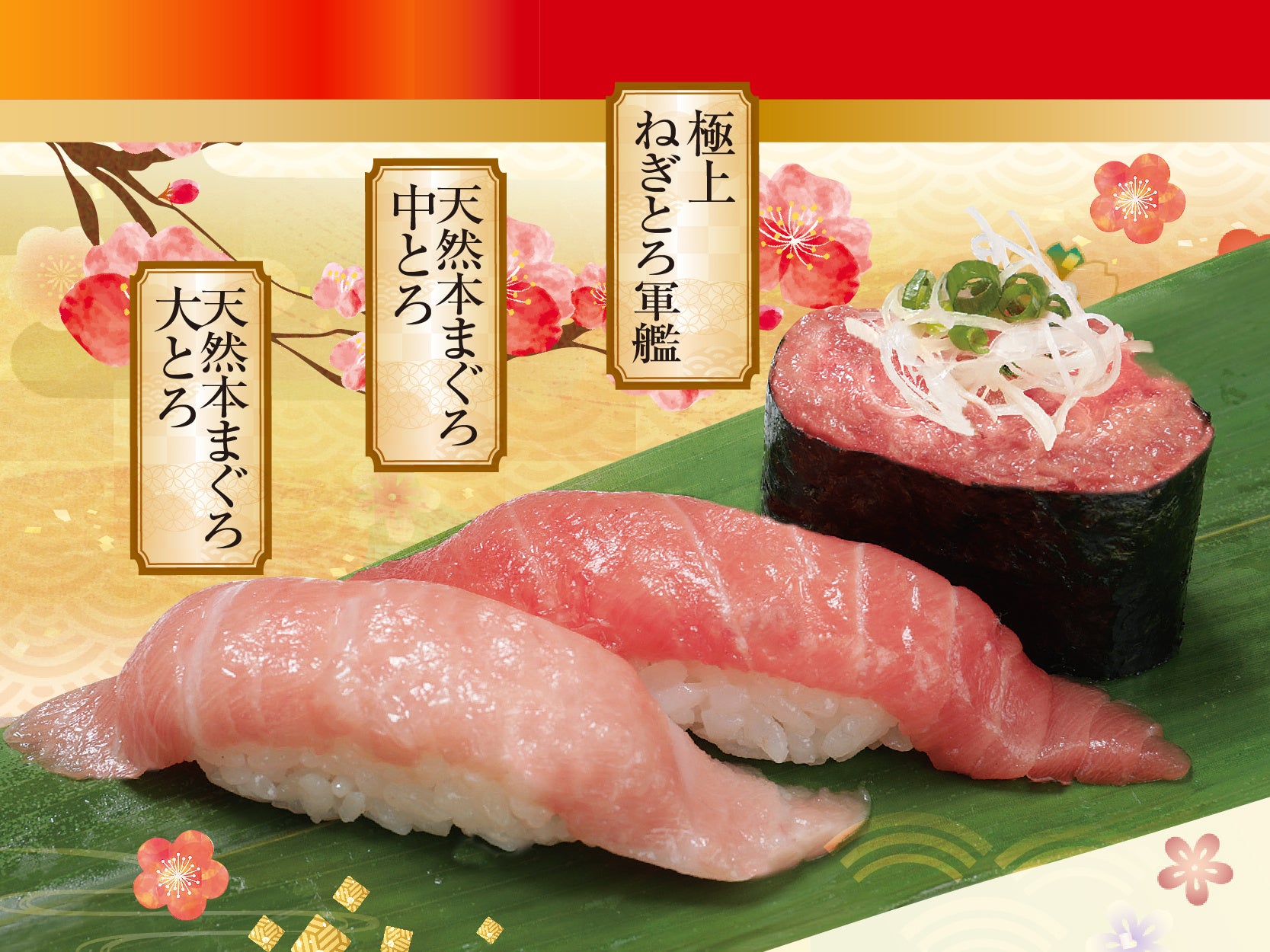 天然本まぐろ大とろ、天然本まぐろ中とろ、極上ねぎとろ軍艦