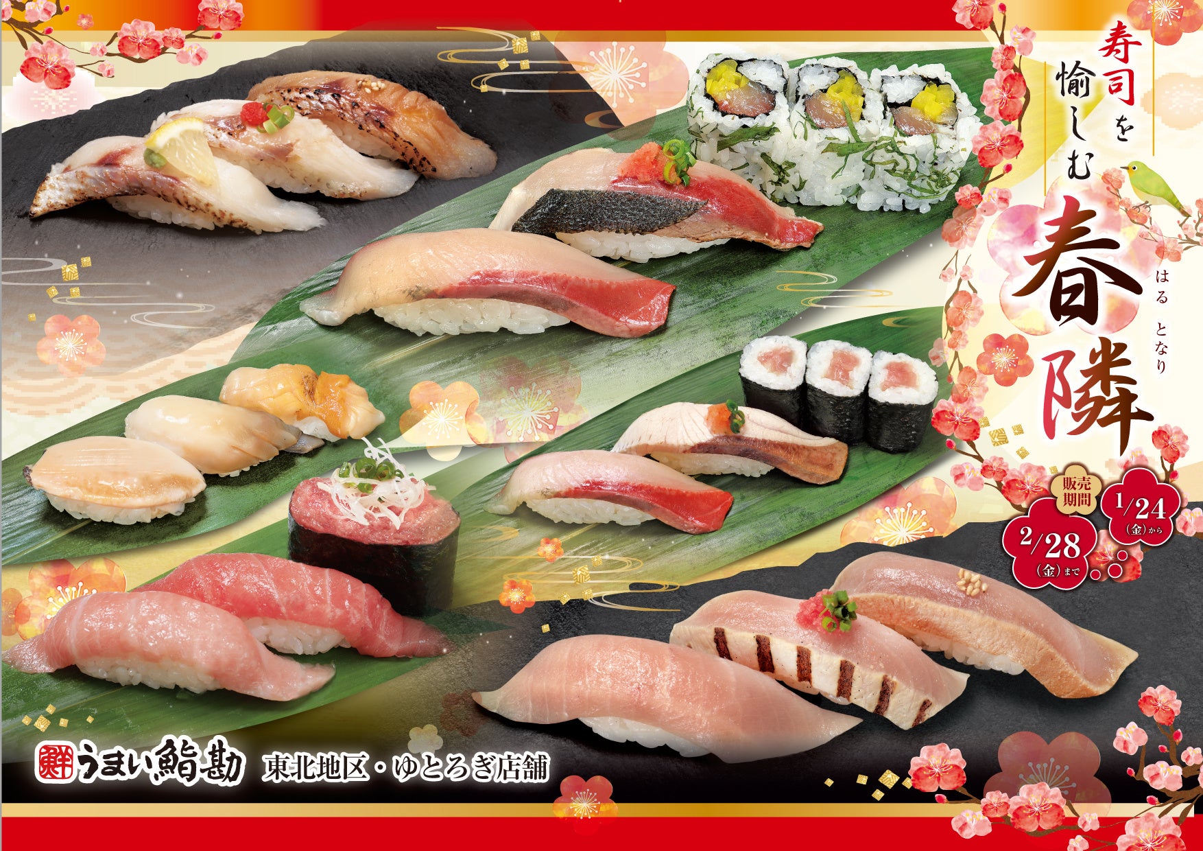 株式会社アミノ(本社:宮城県仙台市、代表取締役社長:上野 敏史)が運営する寿司業態 「うまい鮨勘」では、東北地区・ゆとろぎ店舗において「寿司を愉しむ春隣(はるとなり)」と題したフェアを2025年1月24日(金)から2月28日(金)までの期間限定で販売いたします。冬が旬のネタも終盤。季節が変わる前にぜひご賞味下さい!