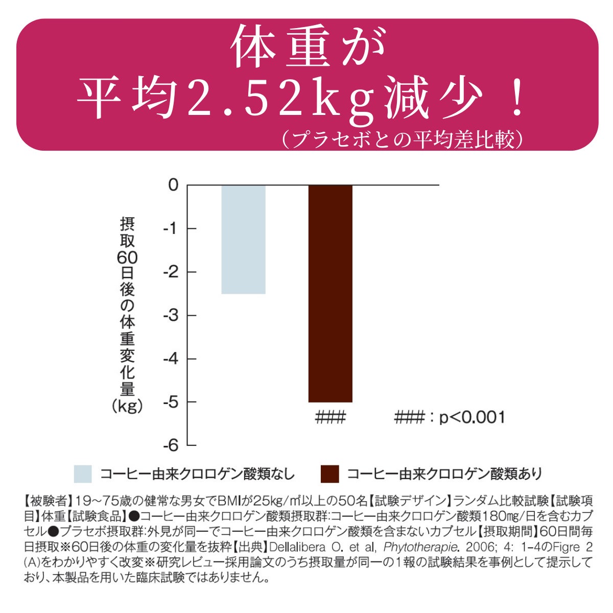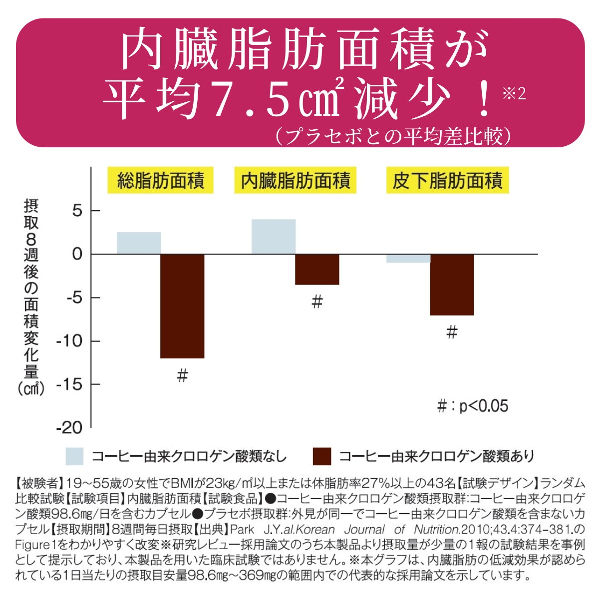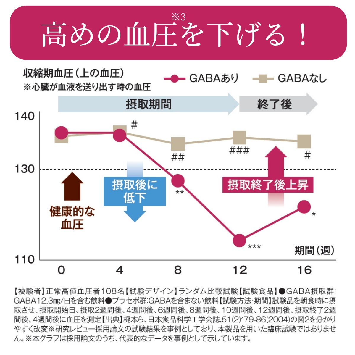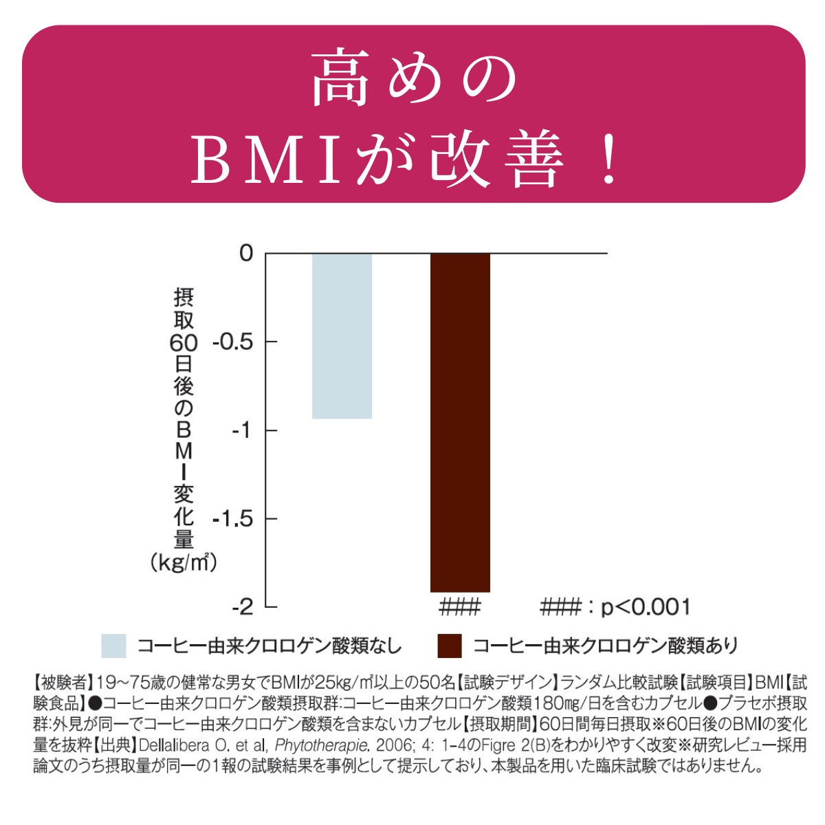 【届出表示】本品にはコーヒー由来クロロゲン酸類、GABAが含まれます。コーヒー由来クロロゲン酸類には肥満気味の方のお腹の脂肪(内臓脂肪)や体重の減少を助け、高めのBMIの改善に役立つ機能、GABAには⑴仕事や勉強などによる一時的な精神的ストレスや疲労感の緩和およびリラックス作用、⑵肌の乾燥が気になる方の肌の弾力を維持し、肌の健康を守るのを助ける機能、⑶血圧が高めの方の血圧を下げる機能が報告されています。