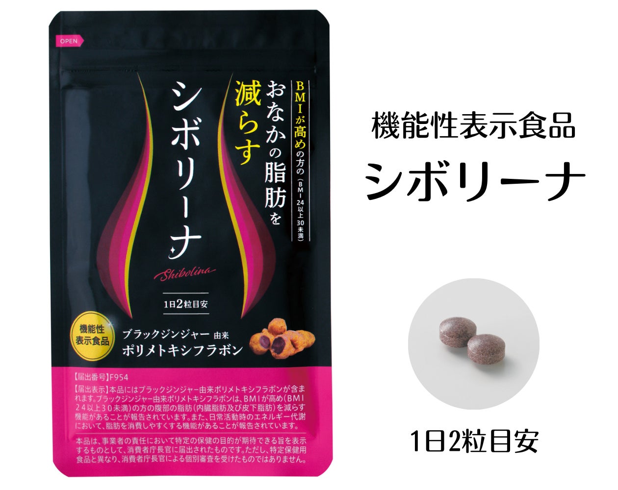 おなかまわりに増え続ける余分な脂肪、そんなお悩みにオススメの「機能性表示食品 シボリーナ」は、黒ショウガ由来のポリメトキシブラボンを配合し、おなかの脂肪を減らして、日常生活のエネルギー代謝をサポートする目的の機能性表示食品です。1日2粒、毎日飲むだけ。科学的根拠のある機能性表示食品です。