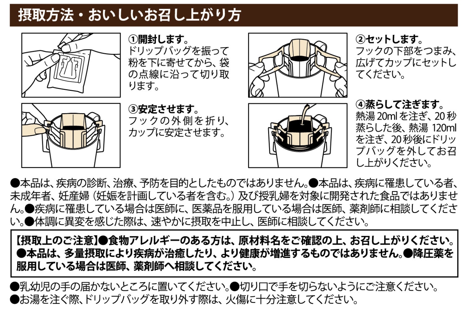 ●栄養成分表示【ドリップバッグ2袋(16g)当たり】( )内は抽出後(「摂取方法」)による:エネルギー 67kcal(19.6kcal),たんぱく質 3g(0g),脂質 1g(0g),炭水化物 11g(4g),食塩相当量 0g(0g)●機能性関与成分(抽出後) コーヒー由来クロロゲン酸類:180mg,GABA:100mg