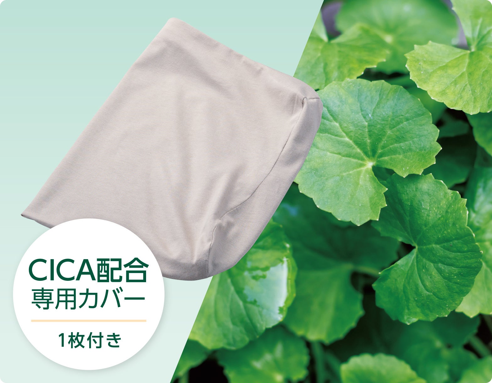 本商品には、CICA配合の専用カバーを1枚セットしています。CICAはツボクサ由来の美容成分として知られており、本商品ではカバーに配合。やわらかな肌触りに仕上げました。睡眠時間をより心地よく過ごしたい方や常に美容を意識したい方におすすめです。