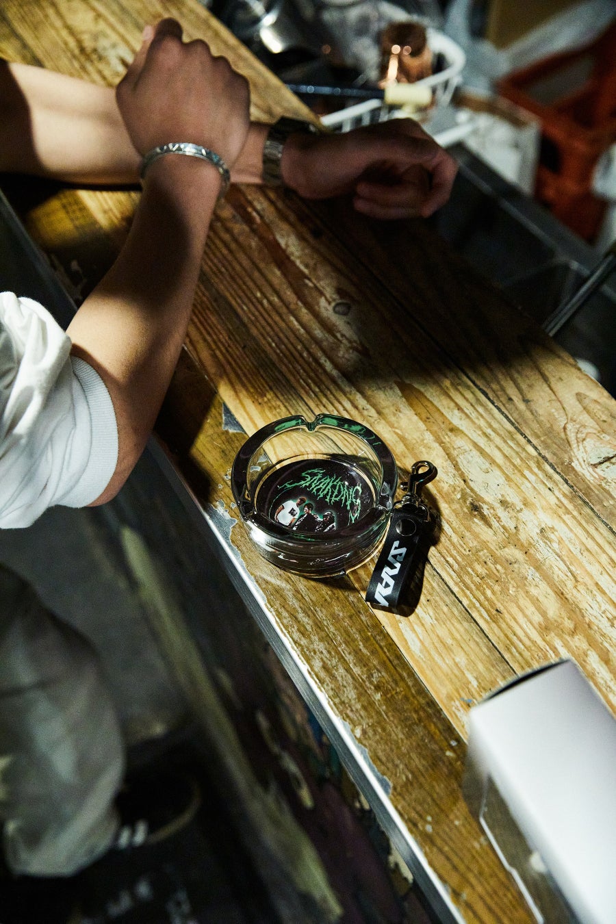 スニ垢のデスロゴとメンバーの写真の入ったアッシュトレイ。