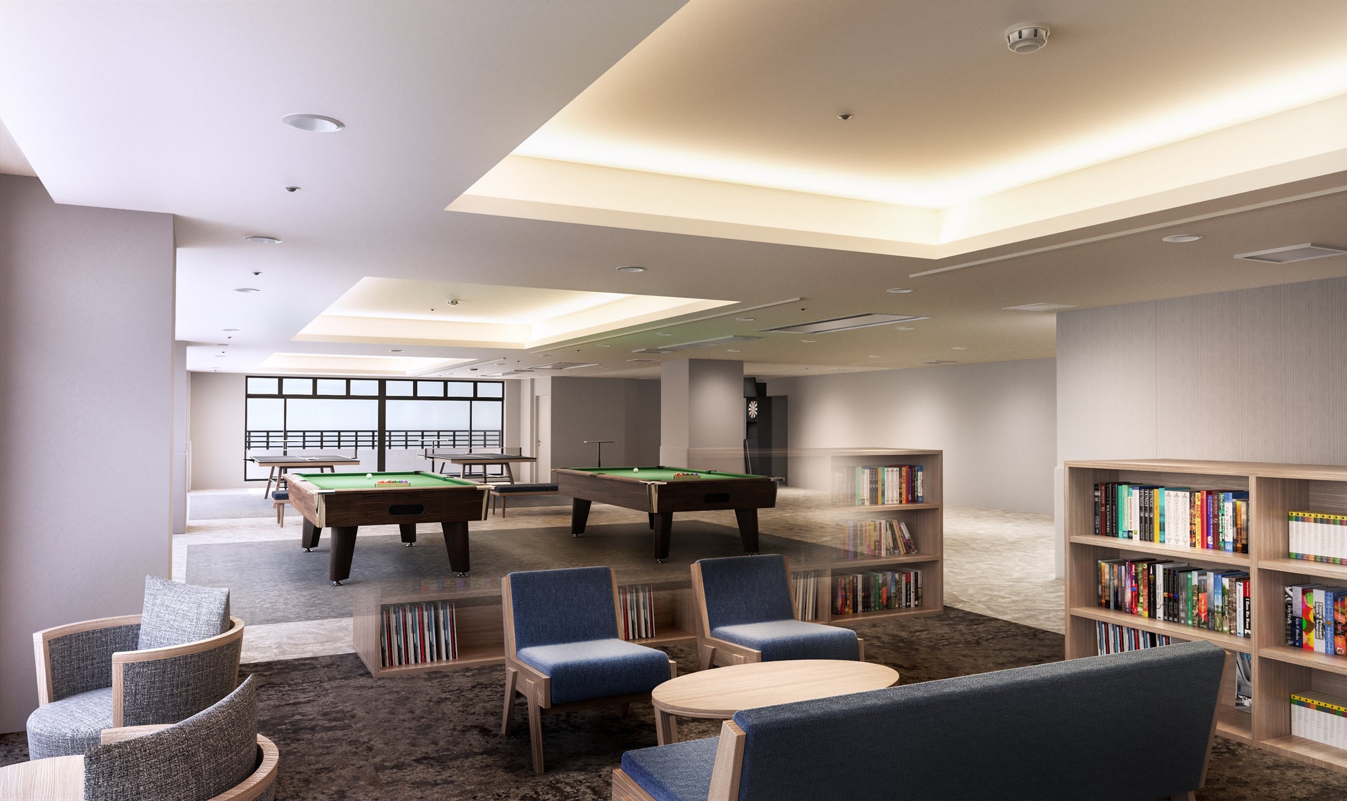 大きな窓から陽が差し込む広いプレイルームは、卓球やビリヤードのほか、ダーツやテーブルサッカー、ポーカーが体験でき、大人も子供も楽しめる場所となっています。気軽に読める本やコミックを揃えたライブラリースペースもあり、ソファでくつろぎながらお過ごしいただけます。