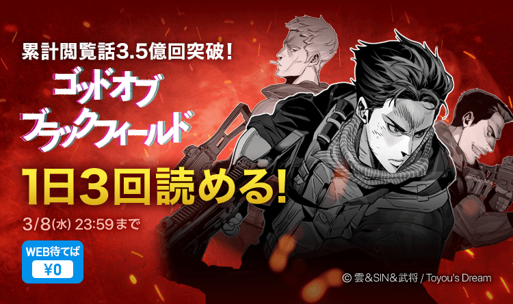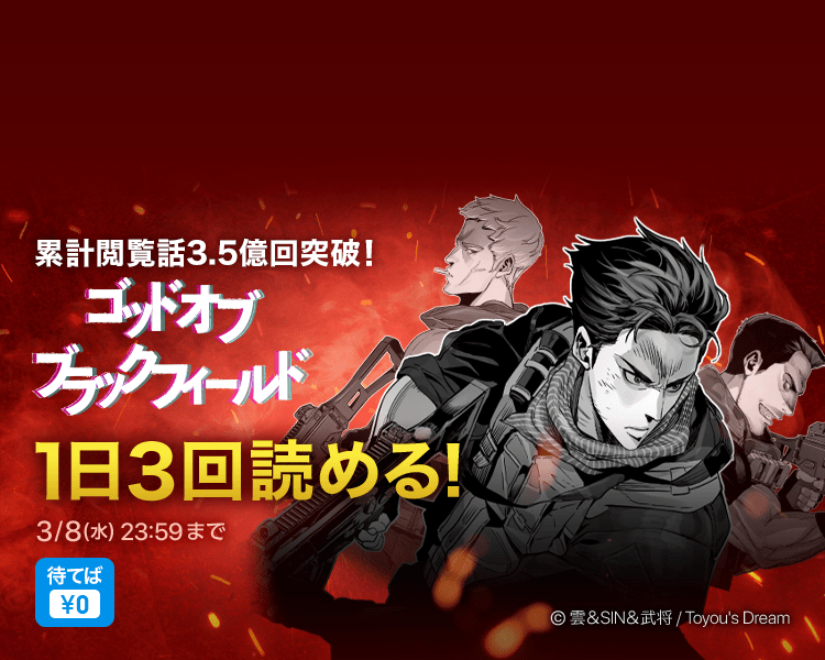 株式会社カカオピッコマ(本社:東京都港区、代表取締役社⻑:金 在龍)は、同社が運営する電子マンガ・ノベルサービス「ピッコマ」は独占配信SMARTOON『ゴッド オブ ブラックフィールド』(Toyou'sDream)を1日最大3話無料で閲覧できるイベントを開催いたします。今回のイベントは本作品が累計総閲覧話数3,5億話突破を祝うために設けられており、全ピッコマユーザーを対象に3/2(木)〜3/9(木)の1週間限定で行います。