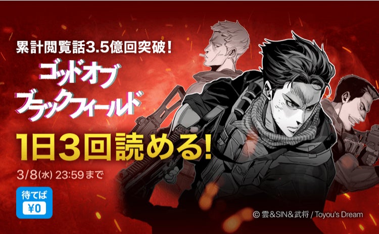 概要:『ゴッド オブ ブラックフィールド』の累計閲覧話数3,5億話突破を祝して期間中、通常23時間待てば1話無料のチャージ時間が8時間待てば1話無料に短縮。