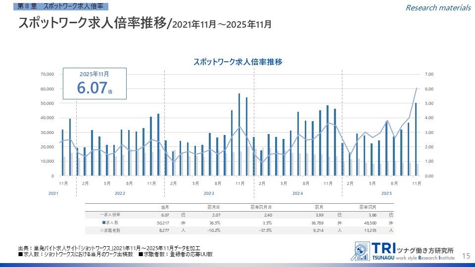 1. スポットワーク求人倍率は6.07倍。前年同月から2.40ポイント上昇。