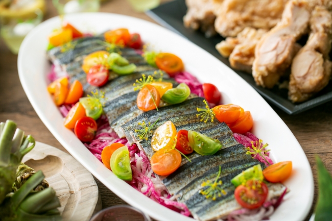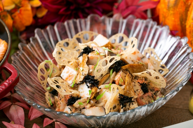 ≪Salad≫漬け秋刀魚の炙りと2色大根のコンポーゼ レモン風味・長野県産キャベツと若鶏のコンフィ 赤紫蘇のシーザースタイル・長野県産 長芋と明太子としめじのヘルシーボール・丸ごとカボチャとキヌア 秋のハーベストサラダ・春日井ノパルのグリーンサラダ