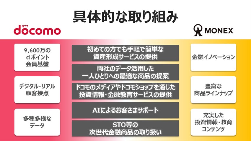 また、dポイント・d払い・dカード・dアカウント等のNTTドコモのサービスとマネックス証券のサービスの連携を強化し、dポイントでの特典設計として取引・残高や口座開設に応じたポイント還元や、d払いを通じた入出金や積立、dカードによる積立もできるよう検討してまいります。