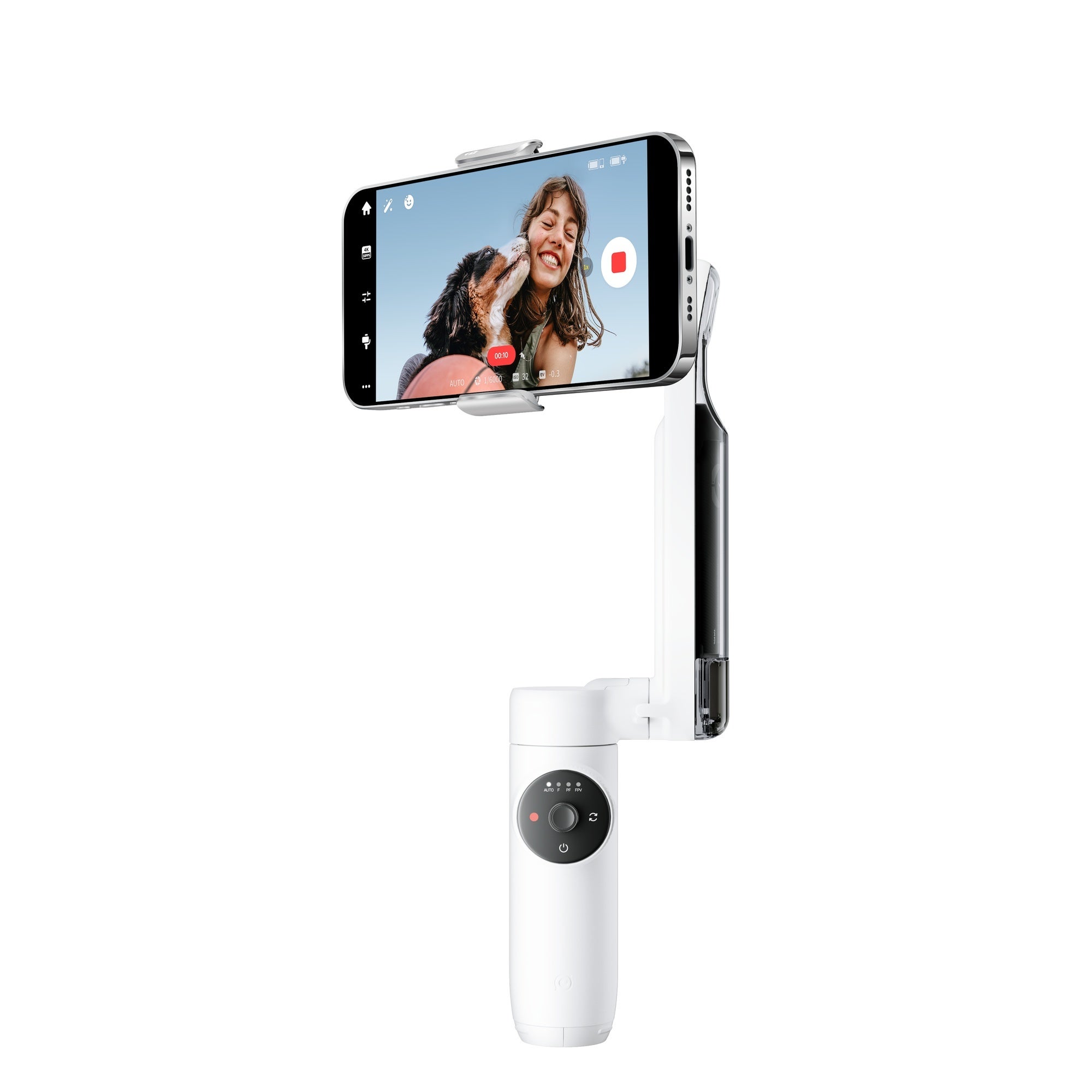 本体に備えたスマートホイールは、撮影のコントロールから動画の再生など、多くの機能にすばやくアクセスすることができます。スマートホイールをスワイプすることで、オート、フォロー、パン・フォロー、FPVの4つのモードに切り替えられます。オートモードでは、ジンバル設定を自動的に調整し、初心者でもブレのないショットを実現。FPVモードではスマートフォンを回転させ、バレルロールなどのFPVドローンのような動きをシミュレートできます。