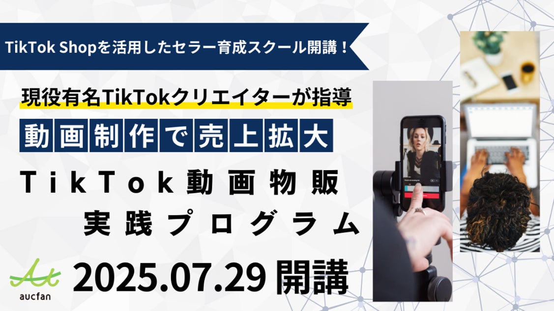 株式会社オークファン(本社:東京都品川区、代表取締役:武永 修一)では、TikTok Shopでのショート動画を活用して販路拡大を目指す物販セラー向けの新スクール『aucfan presents ―TikTokショート動画物販 実践プログラム―』を7月29日(火)より開講します。それに伴い、7月17日(木)より事前説明会を随時開催します。