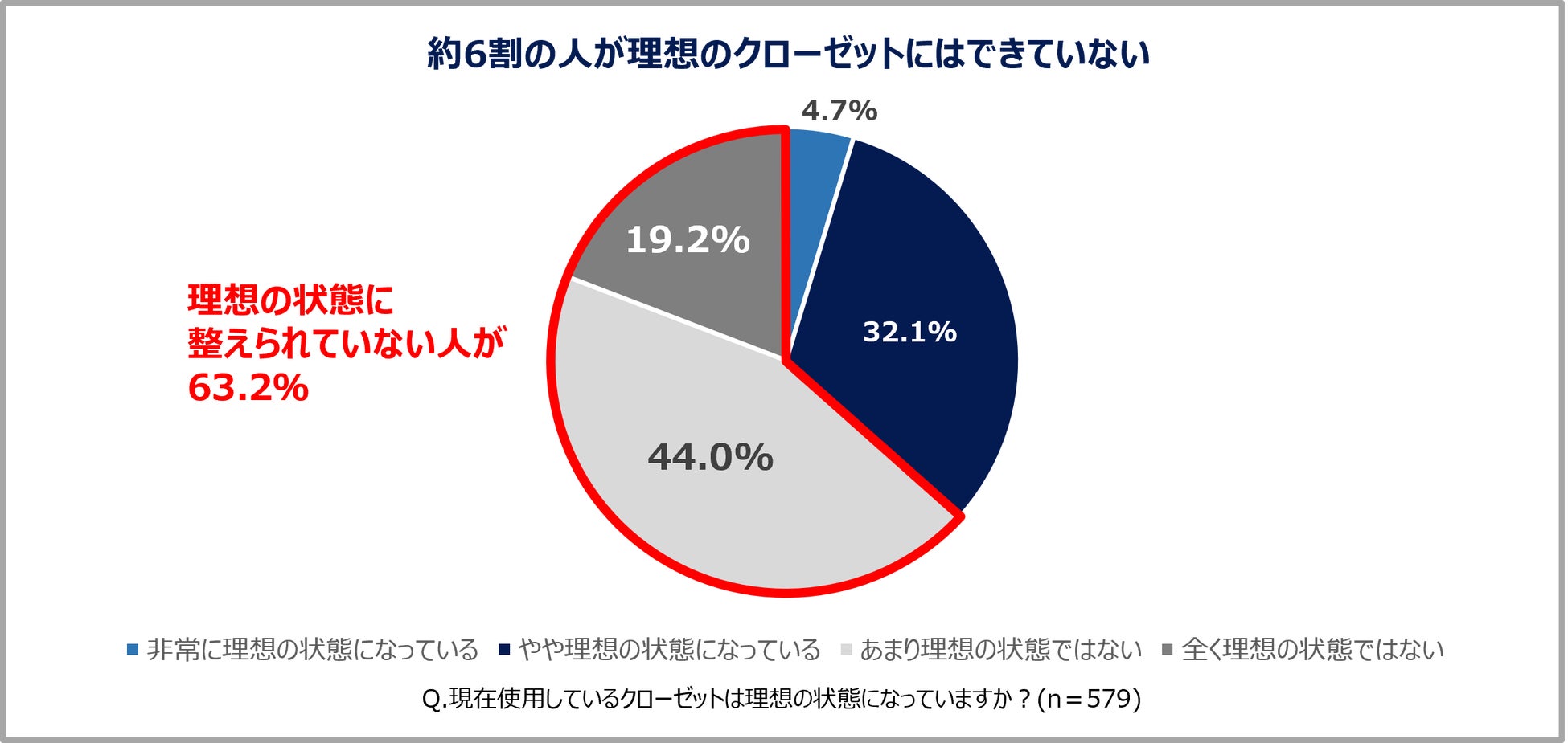 一方で、理想のクローゼットの状態になっているかどうかを聞いたところ、「あまり理想の状態ではない」(44.0%)「全く理想の状態ではない」(19.2%)と、理想の状態に整えられていない人が63.2%にも上りました。