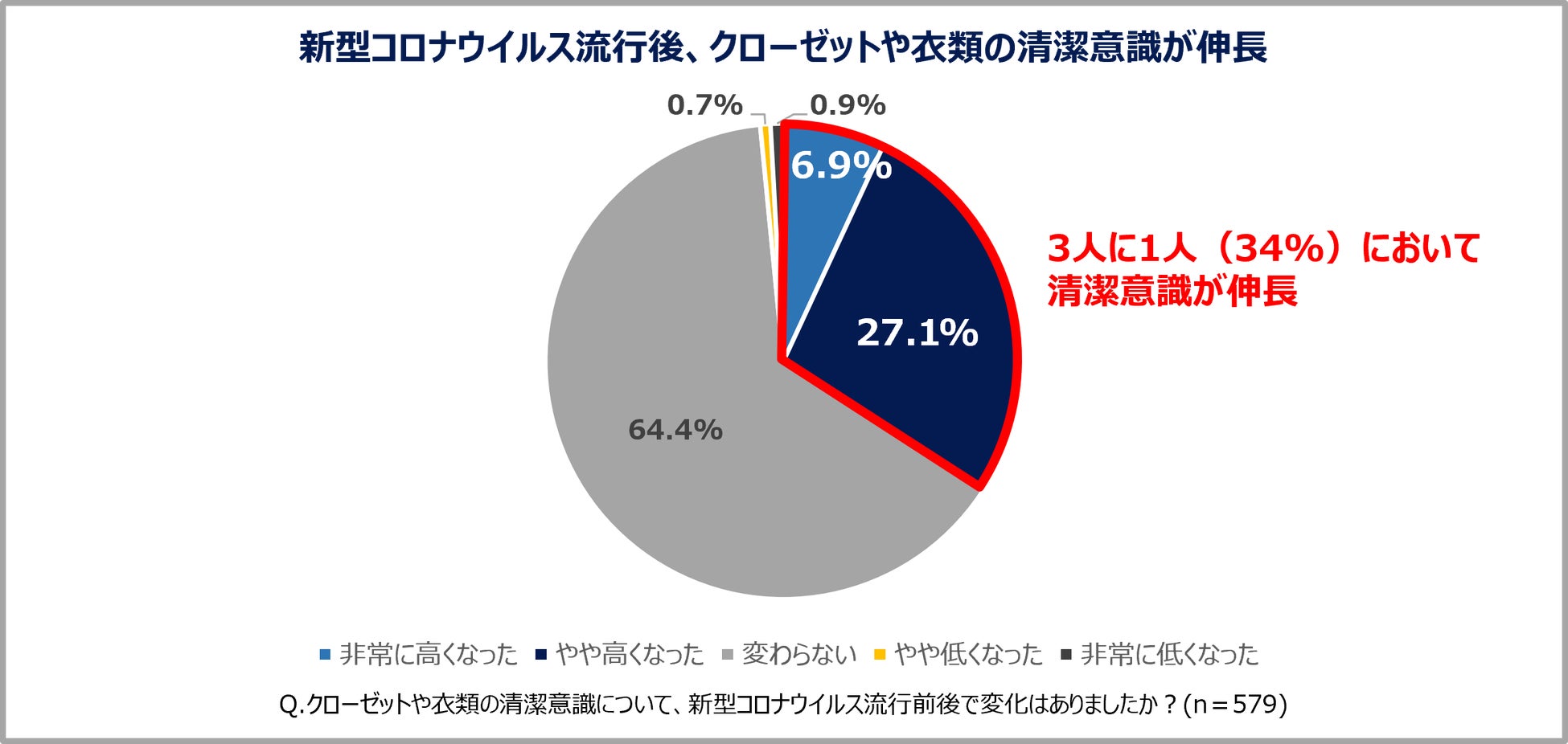 なお、理想のクローゼットとして 「汚れ・カビ・虫・菌などがなく清潔なクローゼット」が上位に挙がりましたが、さらに新型コロナウイルス流行の前後でクローゼットや衣類の清潔意識について「非常に高くなった」(6.9%)「やや高くなった」(27.1%)と3人に1人(34%)の方は清潔意識が高まっていることが分かりました。