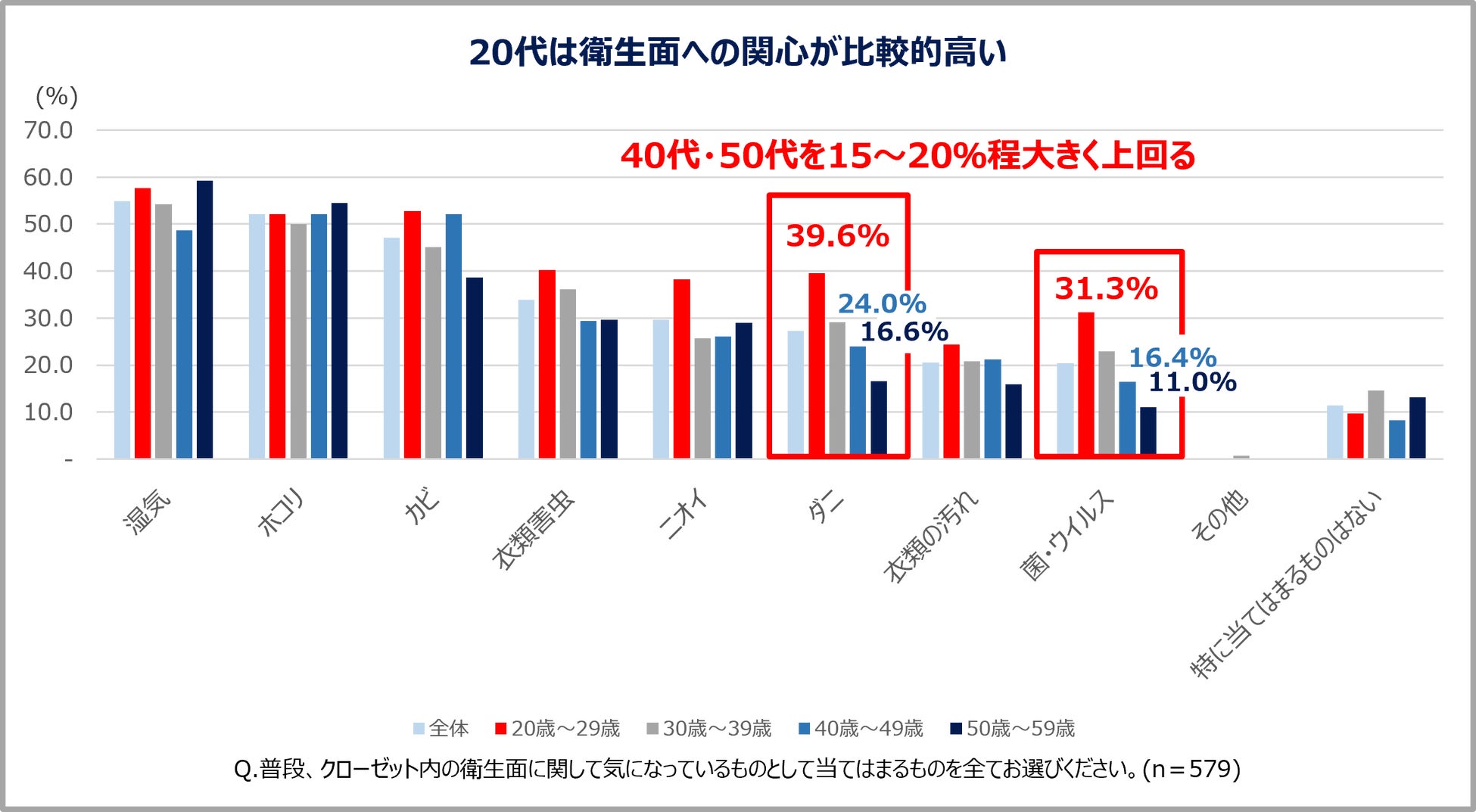 クローゼット内の衛生面に関しても約9割が気になると回答し、1位が「湿気」(54.9%)、2位が「ホコリ」(52.2%)、3位が「カビ」(47.2%)、4位が「衣類害虫」(33.9%)と続きました。年齢別では、20代の回答が「ホコリ」以外の項目において全体を上回り、特に「ダニ」「菌・ウイルス」においては20代の回答が40代・50代を15~20%程大きく上回るなど、20代は衛生面への関心が比較的高いことが分かりました。