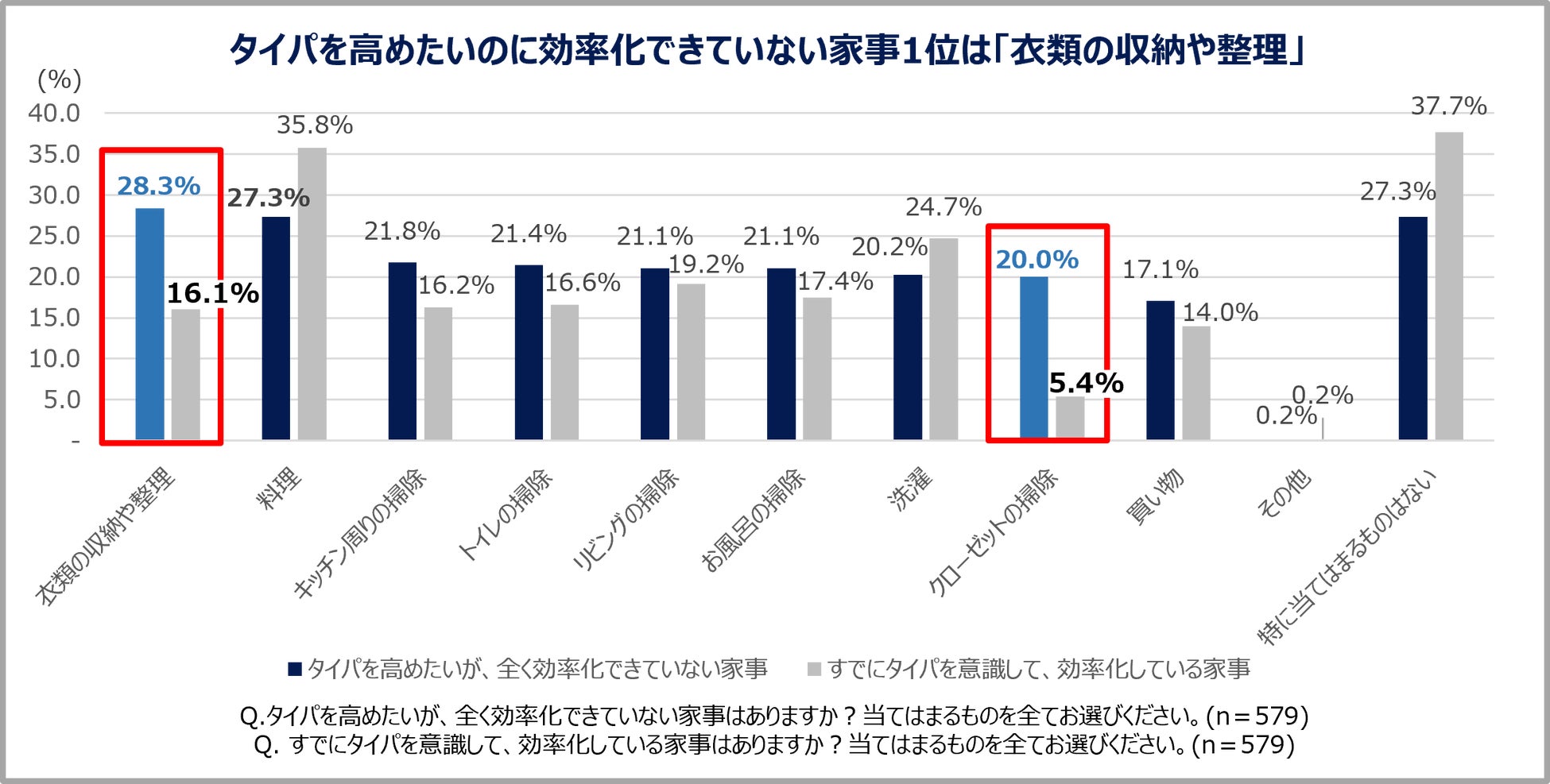 一方、クローゼットや衣類の管理においてはタイパを追求できていない実態が明らかになりました。タイパを高めたいが全く効率化できていない家事があるかどうかを聞いたところ、1位は「衣類の収納や整理」(28.3%)、2位は「料理」(27.3%)とほぼ並びました。また、特筆すべき項目が「クローゼットの掃除」で、タイパを高めたいが全く効率化できていないと答えた人(20.0%)は、すでにタイパを意識して効率化していると答えた人(5.4%)の約3.7倍に上り、全家事の中で理想と実態のギャップが最も大きいことがわかりました。