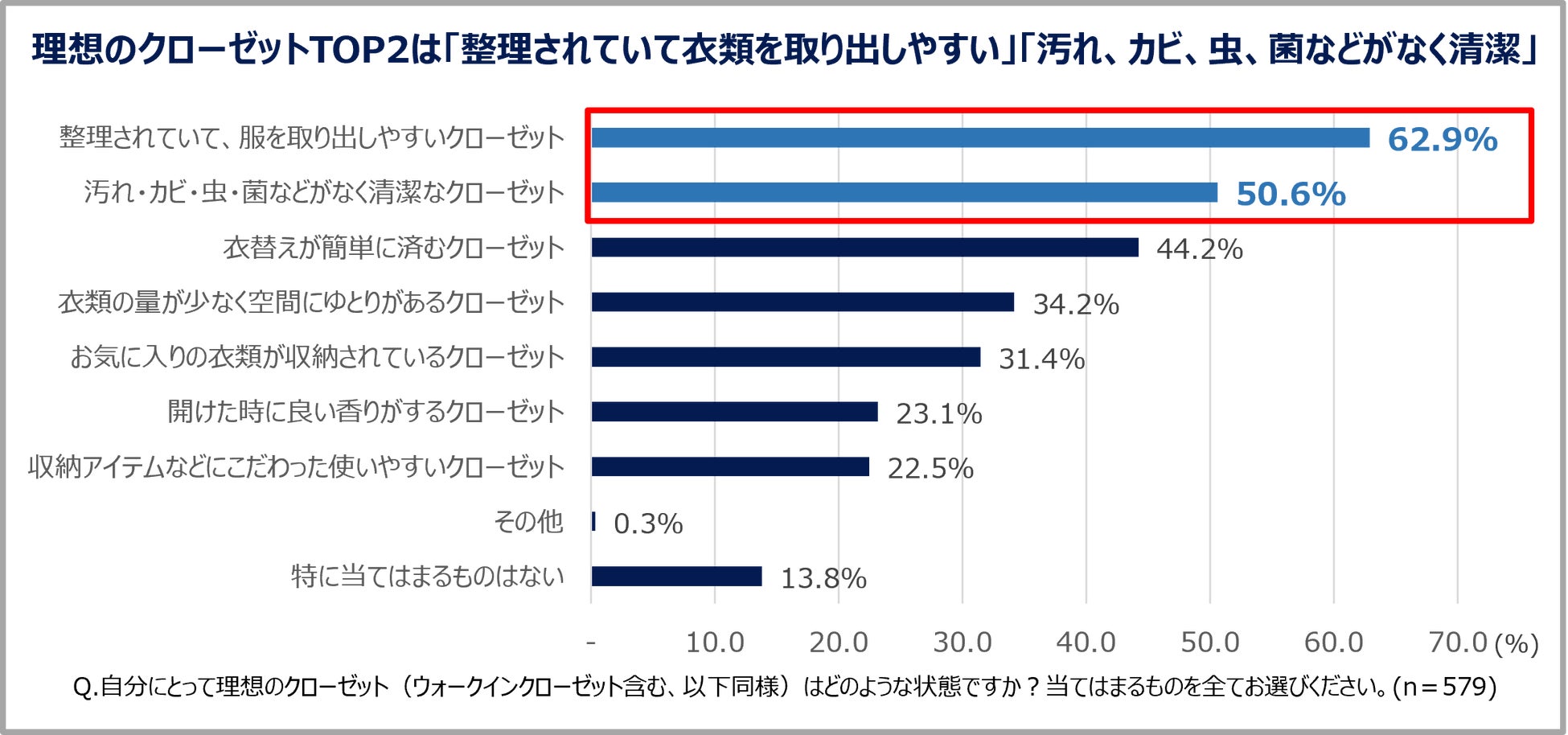理想のクローゼットTOP2は「整理されていて、服を取り出しやすいクローゼット」「汚れ・カビ・虫・菌などがなく清潔なクローゼット」