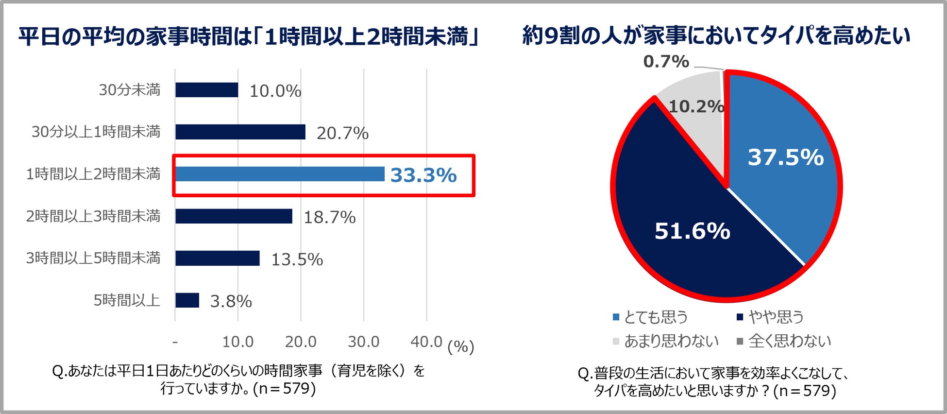家事の実態について調査したところ、平日1日あたりの家事時間(育児を除く)は平均「1時間以上2時間未満」の回答者が最多となりました。そのような状況下で、約9割の人が家事においてタイパを高めたいと思うと回答し、タイパへの関心が非常に高まっていることが伺えます。