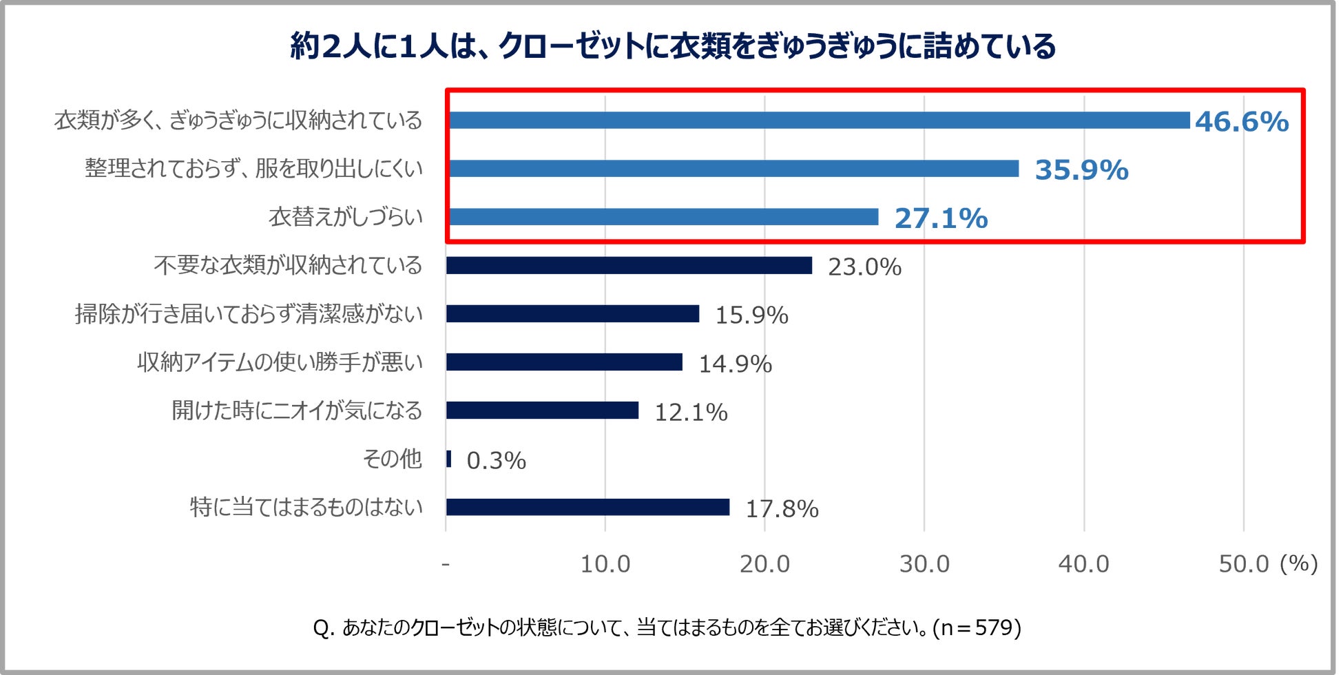クローゼットの現在の状態について、約2人に1人が「衣類が多く、ぎゅうぎゅうに収納されている」(46.6%)と回答し、多くの人が理想のクローゼットTOPに挙げられた「整理されていて、服を取り出しやすいクローゼット」が実現できていない実態が分かりました。次に「整理されておらず、衣類を取り出しにくい」(35.9%)「衣替えがしづらい」(27.1%)と続き、クローゼット内の衣類の場所をうまく整理することができていない可能性が伺えました。