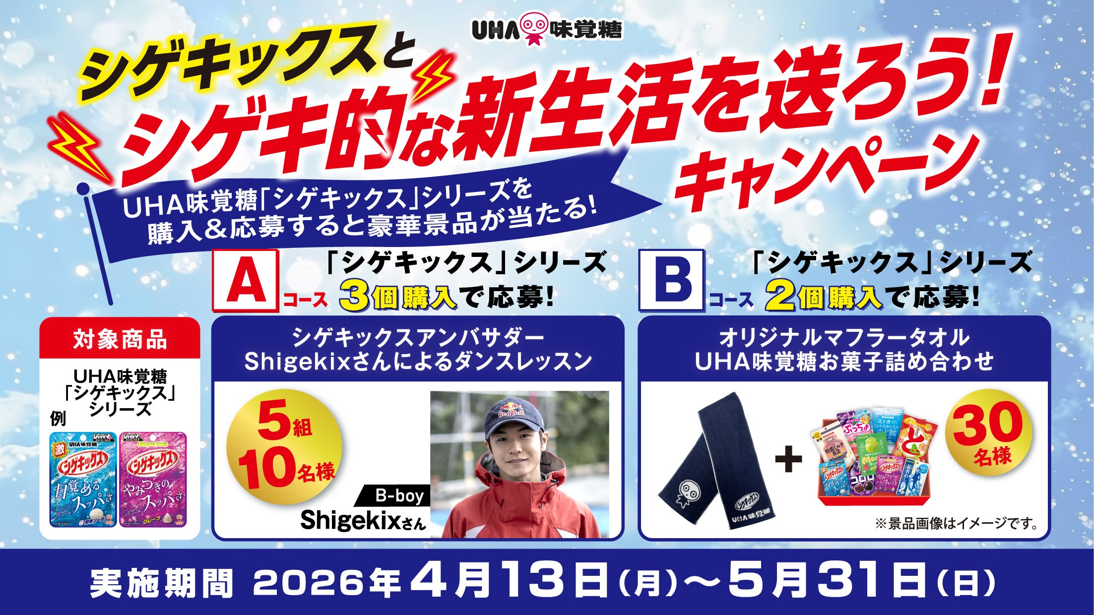 UHA味覚糖株式会社(本社:大阪市中央区、代表取締役:山田泰正)は、2026年4月13日(月)から5月31日(日)までの期間中、UHA味覚糖の「シゲキックス」ブランドを購入(Aコース:3個、Bコース:2個)して応募すると、抽選で総計35名様(Aコース:5組10名様、Bコース:30名様)に豪華景品が当たるマストバイキャンペーンを実施します。