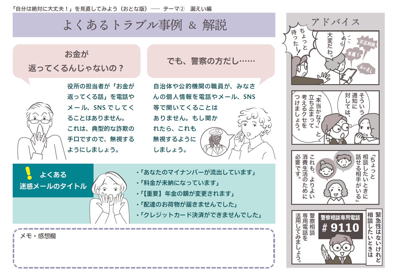 当教材は、大人が日常の消費活動を行ったり、インターネットやSNSを利用したりする際に、「自分は引っかからない、大丈夫」と思い込んでいるトラブルに、どのような「相手」と「状況」がそろった場合に直面してしまうのかを考え、そこから気付きを得ることができる内容になっています。消費活動や情報セキュリティにまつわるリスクを、「投資編」「漏えい編」「消費編」の三つのテーマに分け、投資詐欺やロマンス詐欺、クレジットカード情報や個人情報の漏えい、商品購入時の思わぬサブスクリプション契約など、最近問題になっているトピックを例として取り入れています。こういったリスクを回避する判断スキルを養い、個人の資産や情報を守りながらより良い消費生活やインターネット・SNSの活用につなげていくことを目的としています。