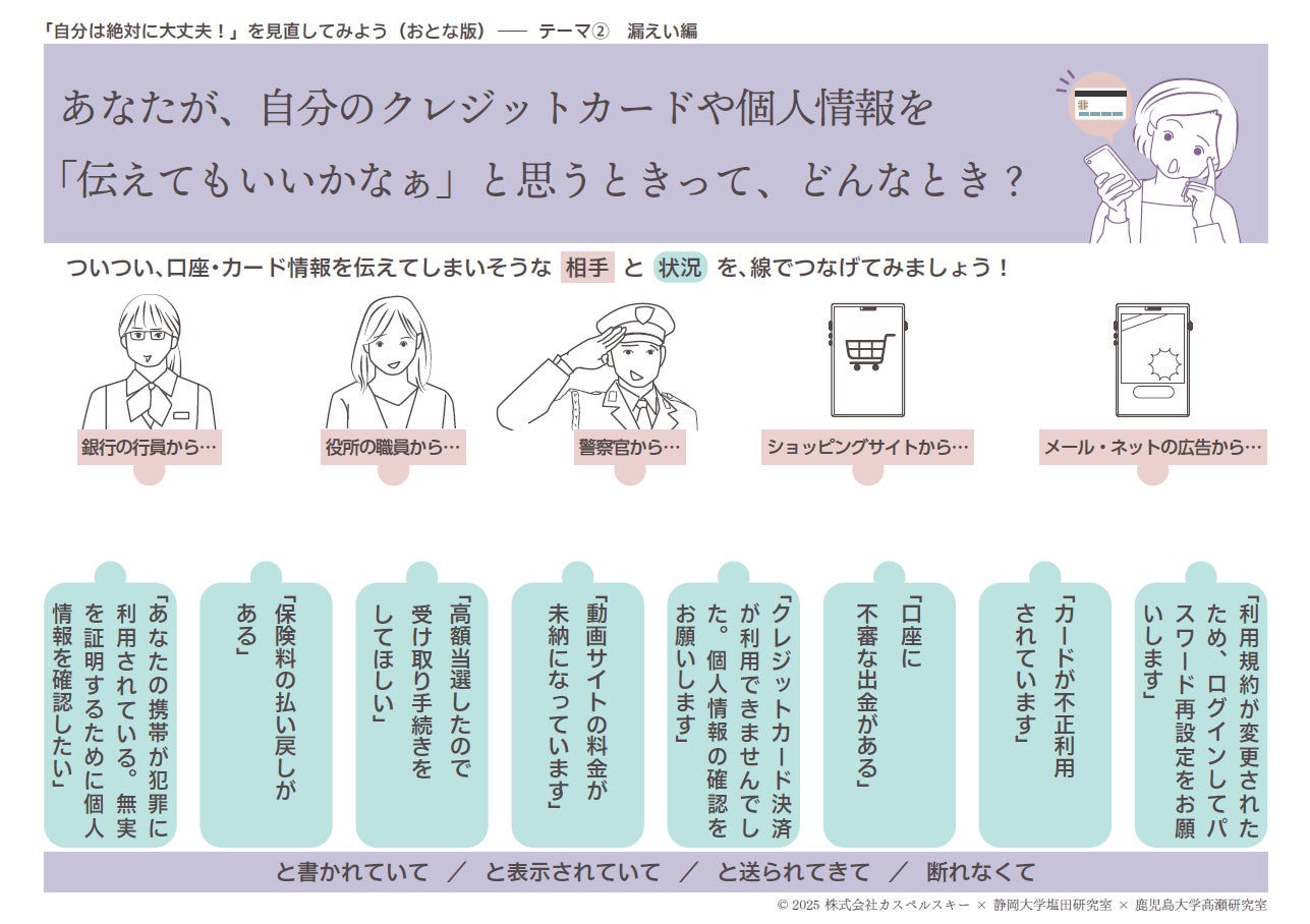 情報セキュリティソリューションを提供する株式会社カスペルスキー(本社:東京都千代田区、代表取締役社長:小林岳夫、以下カスペルスキー)、国立大学法人静岡大学(所在地:静岡県静岡市、学長:日詰一幸、以下静岡大学)、国立大学法人鹿児島大学(所在地:鹿児島県鹿児島市、学長:佐野輝、以下鹿児島大学)は、シニアを含む大人向けの情報リテラシー啓発教材「『自分は絶対に大丈夫!』を見直してみよう(おとな版)」を共同で開発し、教材一式を本日より無償で提供開始します。教材は、社会教育施設などにおける市民向けの講座や、シニア向けの情報セキュリティ啓発の勉強会などでの利用を想定しています。