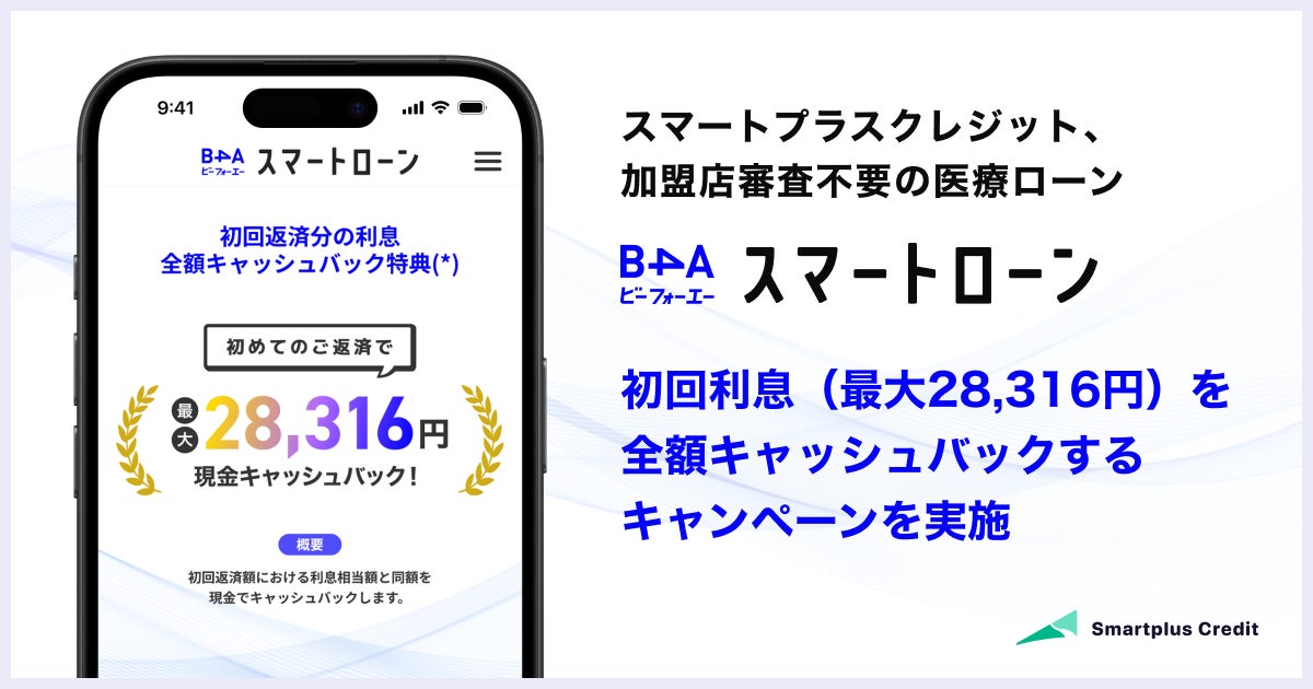 スマートプラスクレジット、加盟店審査不要の医療ローン「B4Aスマートローン」にて初回利息(最大28,316円)を全額キャッシュバックするキャンペーンを実施