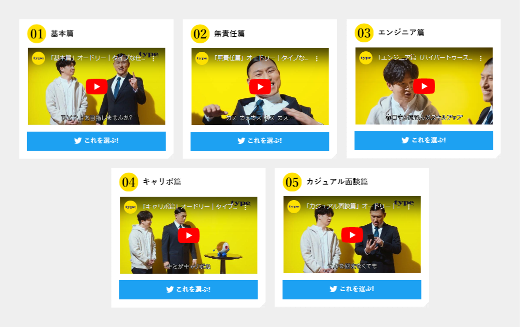 株式会社キャリアデザインセンター(以下 CDC、本社:東京都港区、代表取締役社長兼会長:多田弘實)が運営する総合転職サイト『type(https://type.jp)』は、オードリーのお二人を起用したCMを5本公開しました。また、好きなタイプのCMを選んでツイートすると星野リゾート宿泊ギフト券や直筆サイン入りグッズが当たるTwitterキャンペーンを実施いたします。