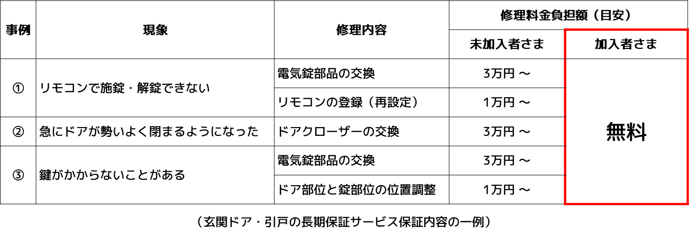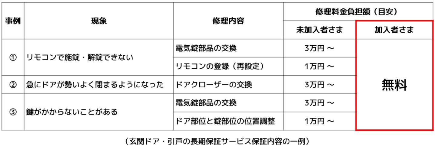 長期保証サービスは玄関ドア・引戸において、これまでは電気錠や電動開閉装置を保証の対象としており、多数のお客さまにご加入いただいておりました。この度LIXILは、お客さまにより長く安心して玄関ドア製品をお使いいただけるよう、電気錠・電動開閉装置の対象拡充(※2)に加え、玄関ドア・引戸を対象といたします。