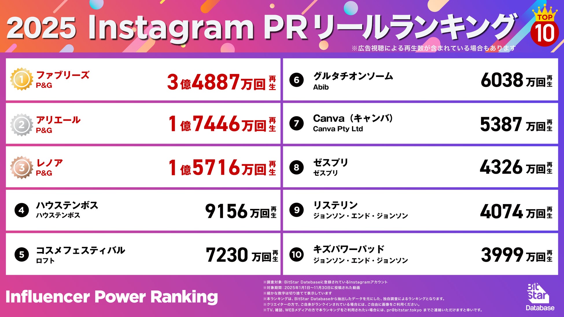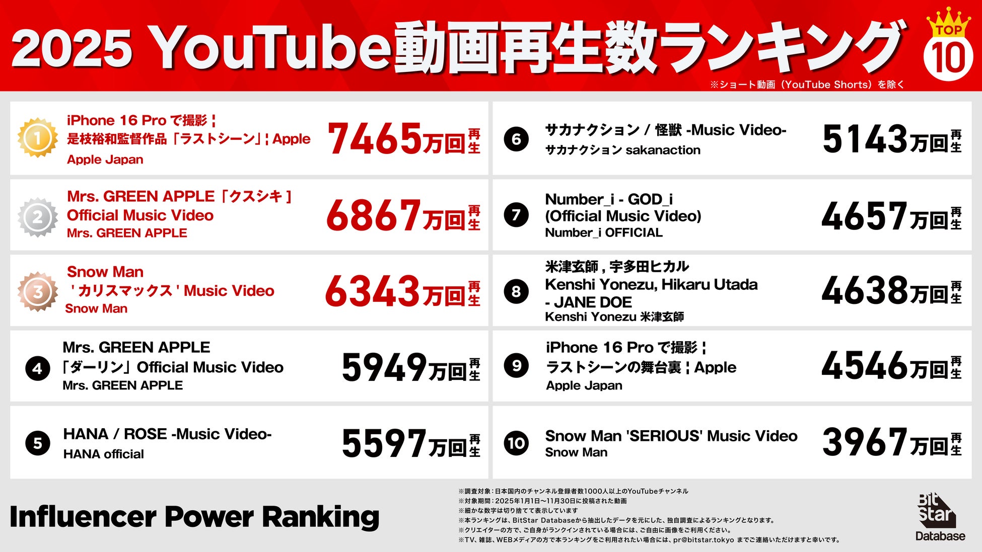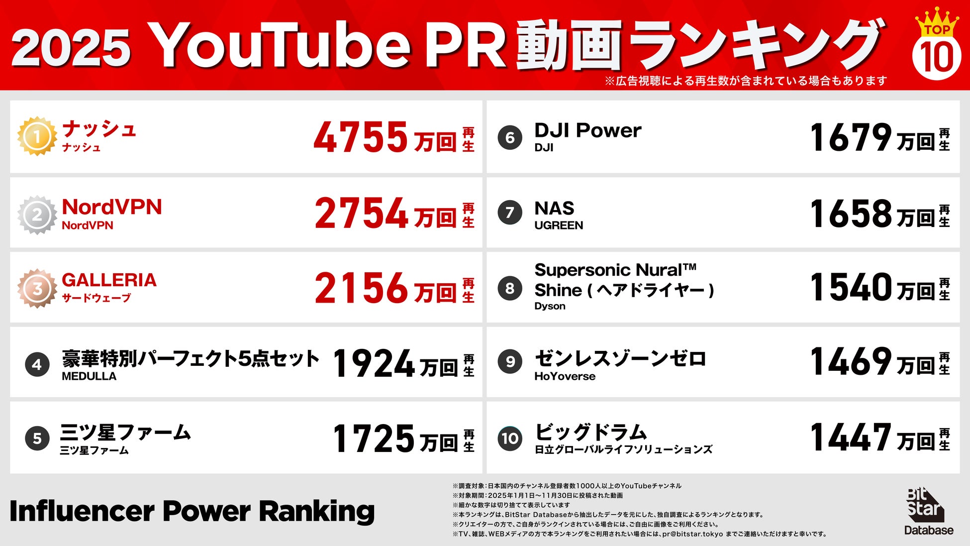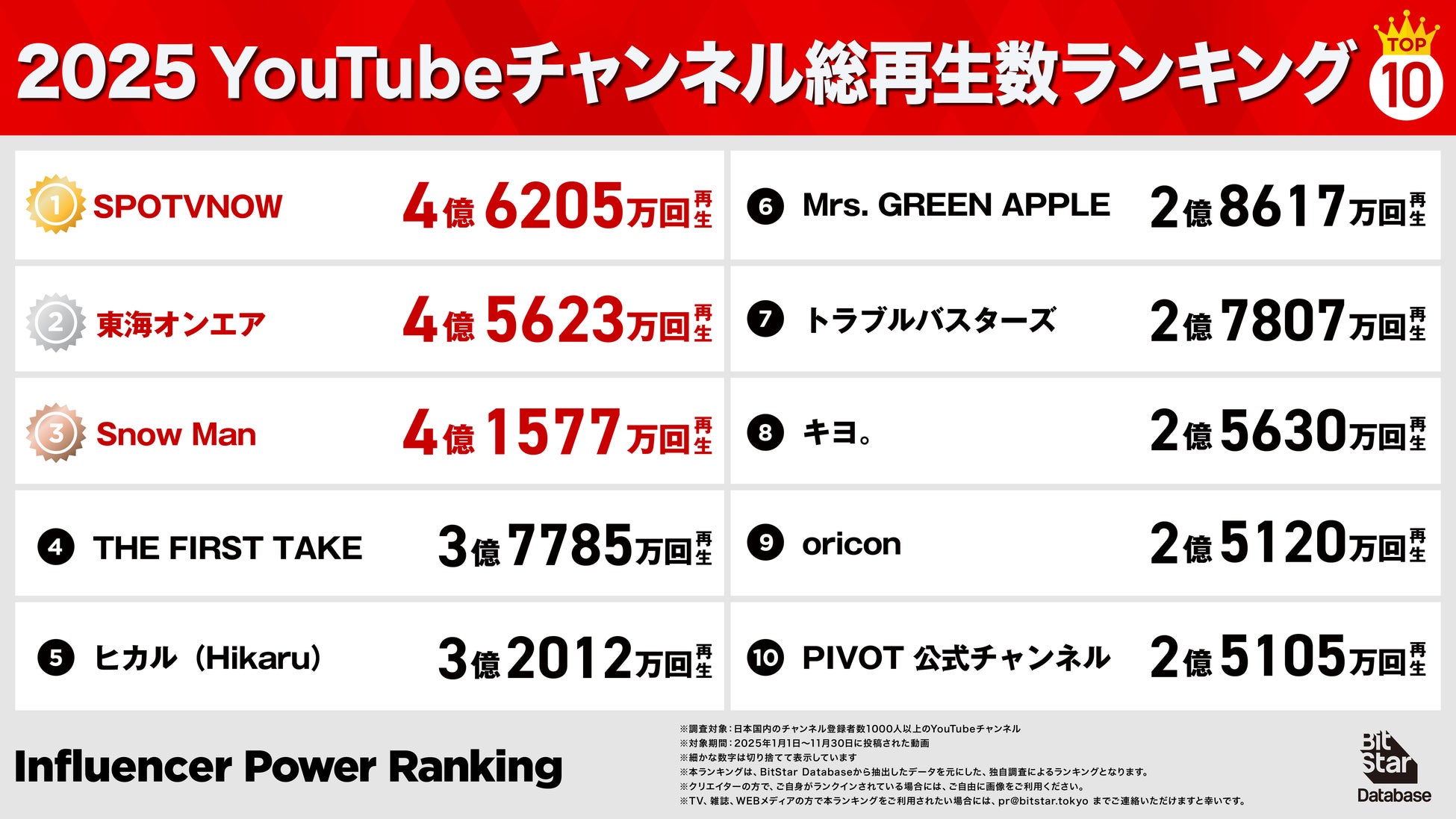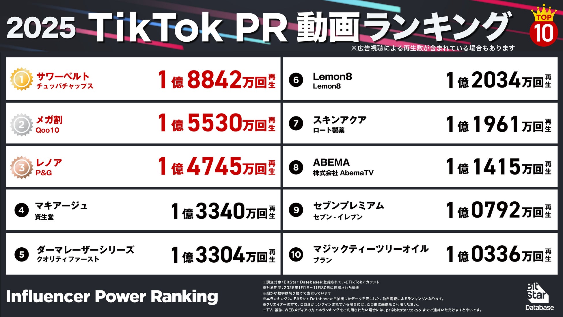 インフルエンサーマーケティングプラットフォームを中心とした様々な事業を展開する株式会社BitStar(本社:東京都渋谷区、代表取締役 社長執行役員CEO:渡邉拓)は、インフルエンサーマーケティングプラットフォーム「BitStar Database」のデータに基づき、2025年(集計期間:1月1日〜11月30日)に活躍した動画クリエイター、チャンネル、PR投稿のランキングを発表しました。