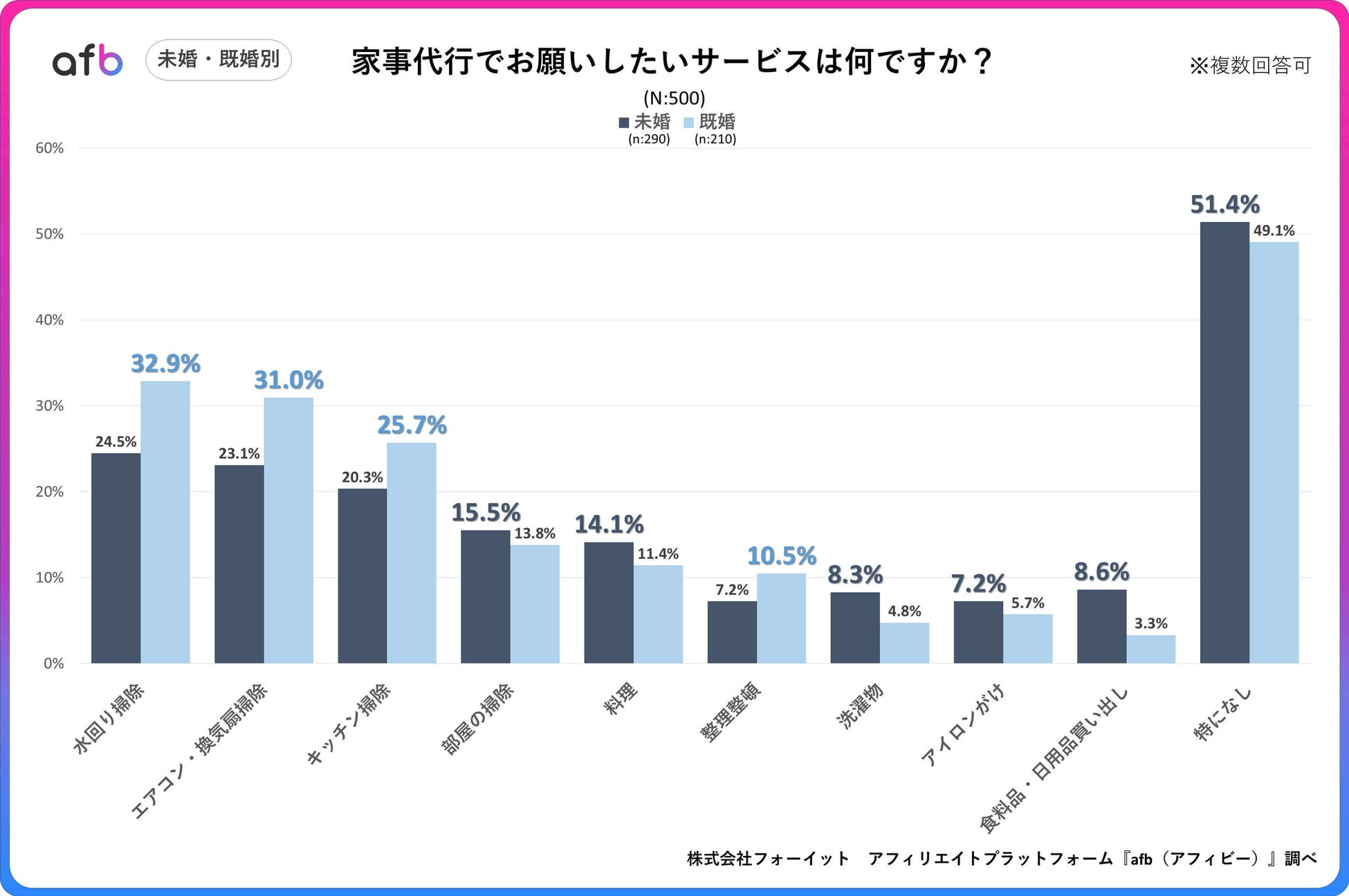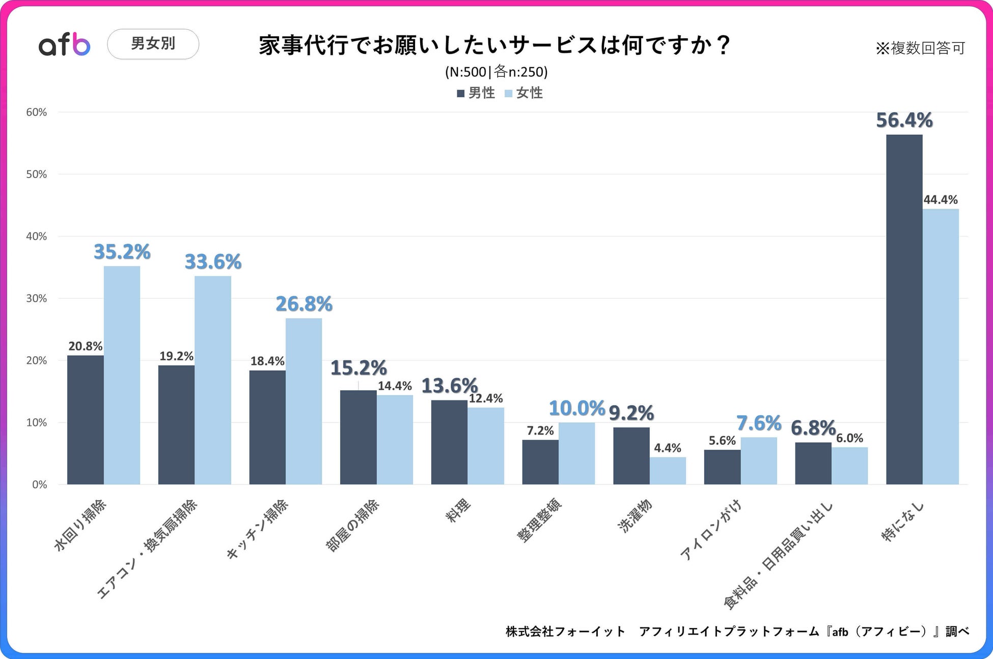アフィリエイトプラットフォーム「afb(アフィビー)」< https://www.afi-b.com/ >の開発運用をおこなう株式会社フォーイットは、全国の20代~60代までの男女500人を対象に家事に関するアンケートを実施し、年代別等の特徴についてまとめました。
