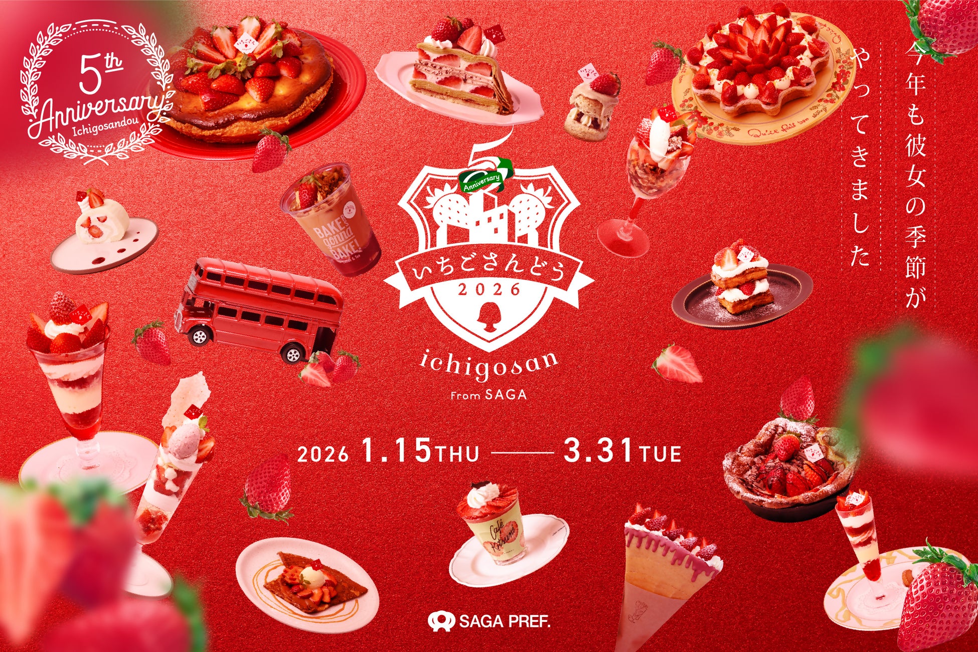 佐賀県は、佐賀のブランドいちご「いちごさん」と表参道のカフェ・レストラン12店舗がコラボレーションし、「いちごさん」メニューを提供する「いちごさんどう2026」を、2026年1月15日(木曜日)の「いちごの日」から、3月31日(火曜日)まで約2か月間に渡り開催します。