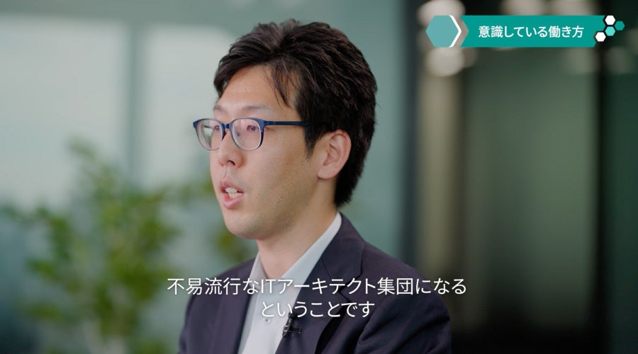 同じグループでともに働くKDDIのグループリーダー安さんから、髙橋さんの挑戦姿勢や頼られる存在としての評価が語られ、両社が一体となってプロジェクトを進める協働の様子が伝わります。また「不易流行なITアーキテクト集団」を掲げ、基盤技術を大切にしながら新しい技術に挑み続けるチームの姿勢や、立場を問わず成長を目指せる文化も紹介しています。
