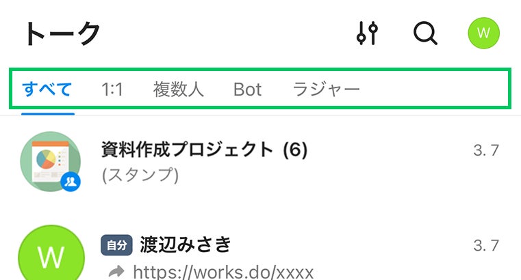 トークルームがカテゴリー別(すべて/1:1/複数人/Bot)に分類して表示されるようになり、目的のトークルームに素早くアクセスできるようになりました。