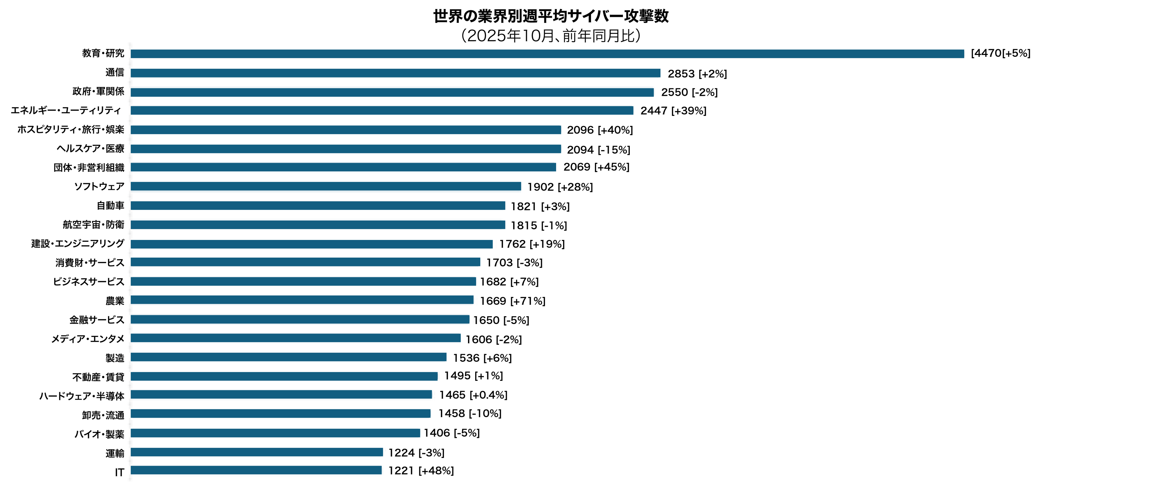 教育・研究分野は引き続き最も標的とされており、組織あたり週平均4,470件の攻撃を受けています(前年比5%増)。通信業界がこれに続き、週平均2,583件の攻撃に直面しています(前年比2%増)。また、政府・軍関係は週平均2,550件で、前年比2%減であったものの、いずれにしても重要インフラやデータ保有量の多い環境が継続的に標的となっていることが明らかになりました。