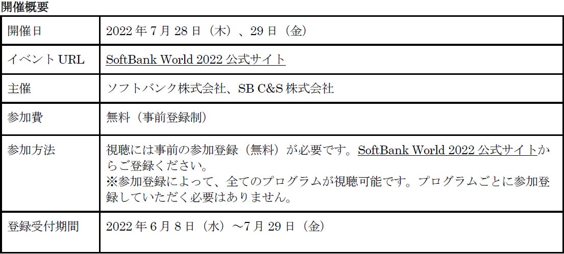 SoftBank World 2022 公式サイトやソフトバンク法人公式Facebookページ「SoftBank for Biz(ソフトバンク フォー ビズ)」(https://www.facebook.com/SoftBankforBiz/)で随時お知らせします。