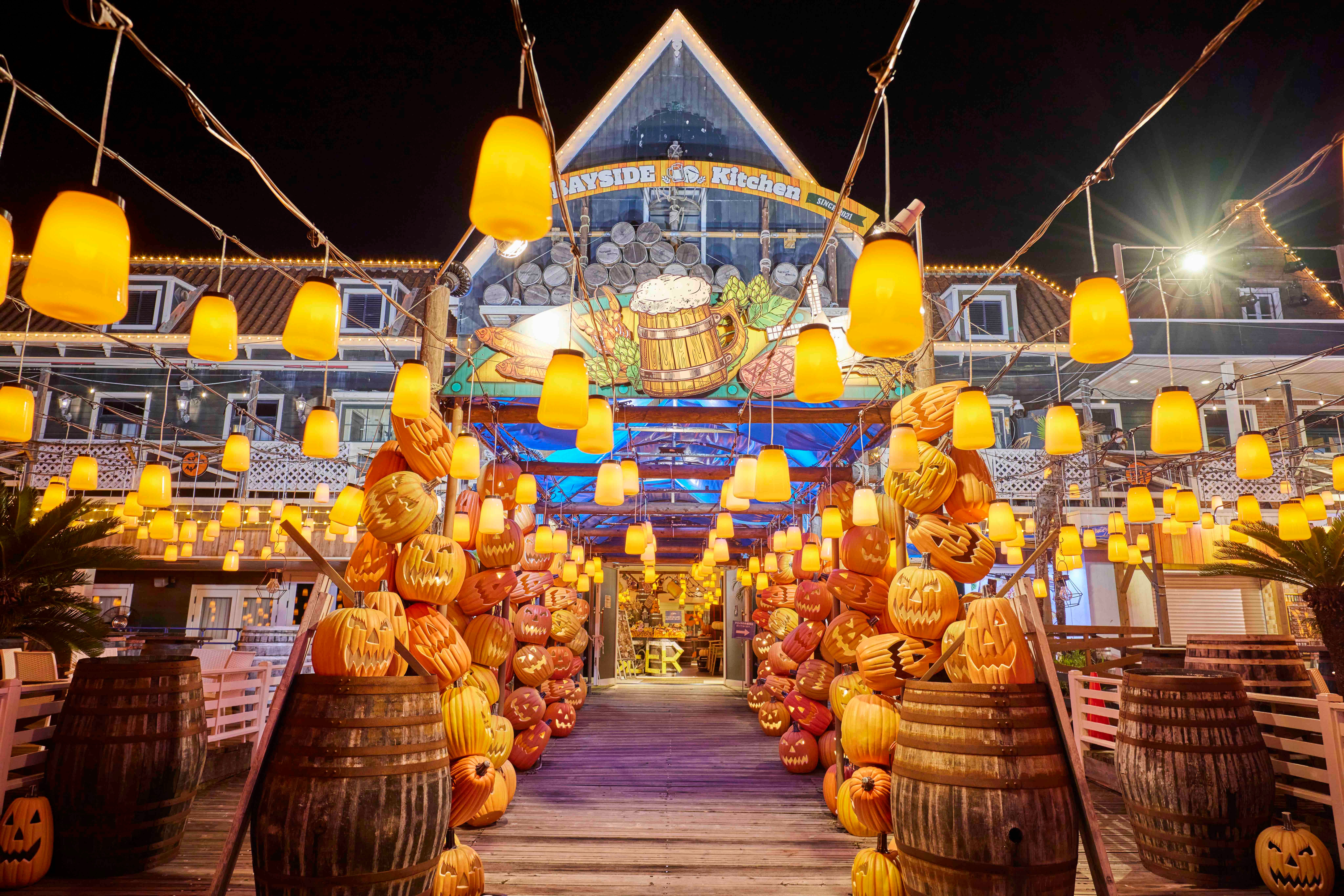 あふれるほどのかぼちゃオブジェとランタンが、ハロウィーンムードを演出します。テラスで心地よい海風を感じながら、BBQグルメを味わおう!