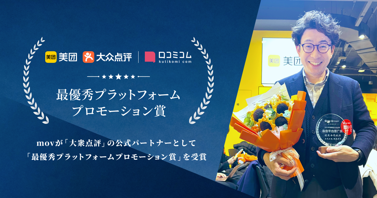 本賞は、パートナー現地(movの場合は日本)で美団・大衆点評の影響力を伸ばすことに貢献したパートナーに授与するのもので、movの口コミアカデミーでの教科書*1コンテンツやオンラインセミナーの開催、展示会参加、オンライン・オフラインワークショップ展開で優良クライアントを招へいするなどオンライン・オフラインの両輪でのマーケティング戦略による成果を評価いただき、今回の受賞に至りました。