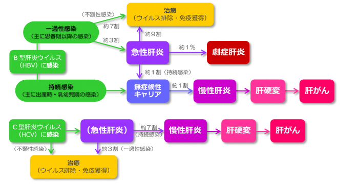 「肝炎」には自覚症状がないため、発見が遅れると、肝硬変又は肝がんに進行してしまう場合も。肝がんの原因の約70%がB型・C型肝炎ウイルスであるとも言われています。