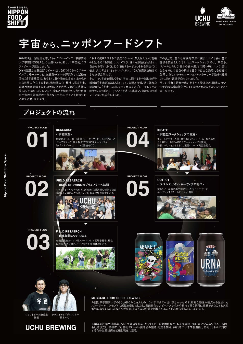 2024年8月山梨県北杜市、うちゅうブルーイングと京都芸術大学 宇宙部(SOLAB)の出逢いから、新しい「宇宙的」クラフトビールが誕生しました。若者の想いをすべて受け止め、うちゅうブルーイングの圧倒的な知識と技術をもって実現させた3種類のクラフトビールをオリジナルパッケージで販売します。