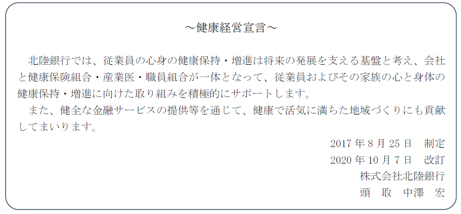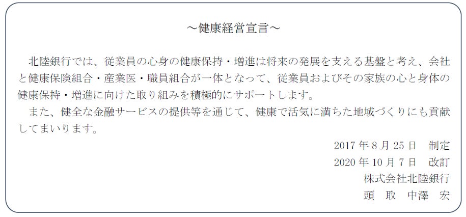 当行では頭取を健康管理責任者として、「健康経営宣言」を制定し、従業員およびその家族の健康保持・増進に繋げる諸施策に取り組んでおります。今後も引き続き、企業の持続的な成長の実現には従業員およびその家族の心身の健康が不可欠であるとの見地に立ち、健康保険組合、産業医および職員組合と連携して、従業員一人ひとりが自らの能力を最大限に発揮できる職場環境を整備し、組織全体の更なる活性化の実現およびSDGsの達成を目指してまいります。