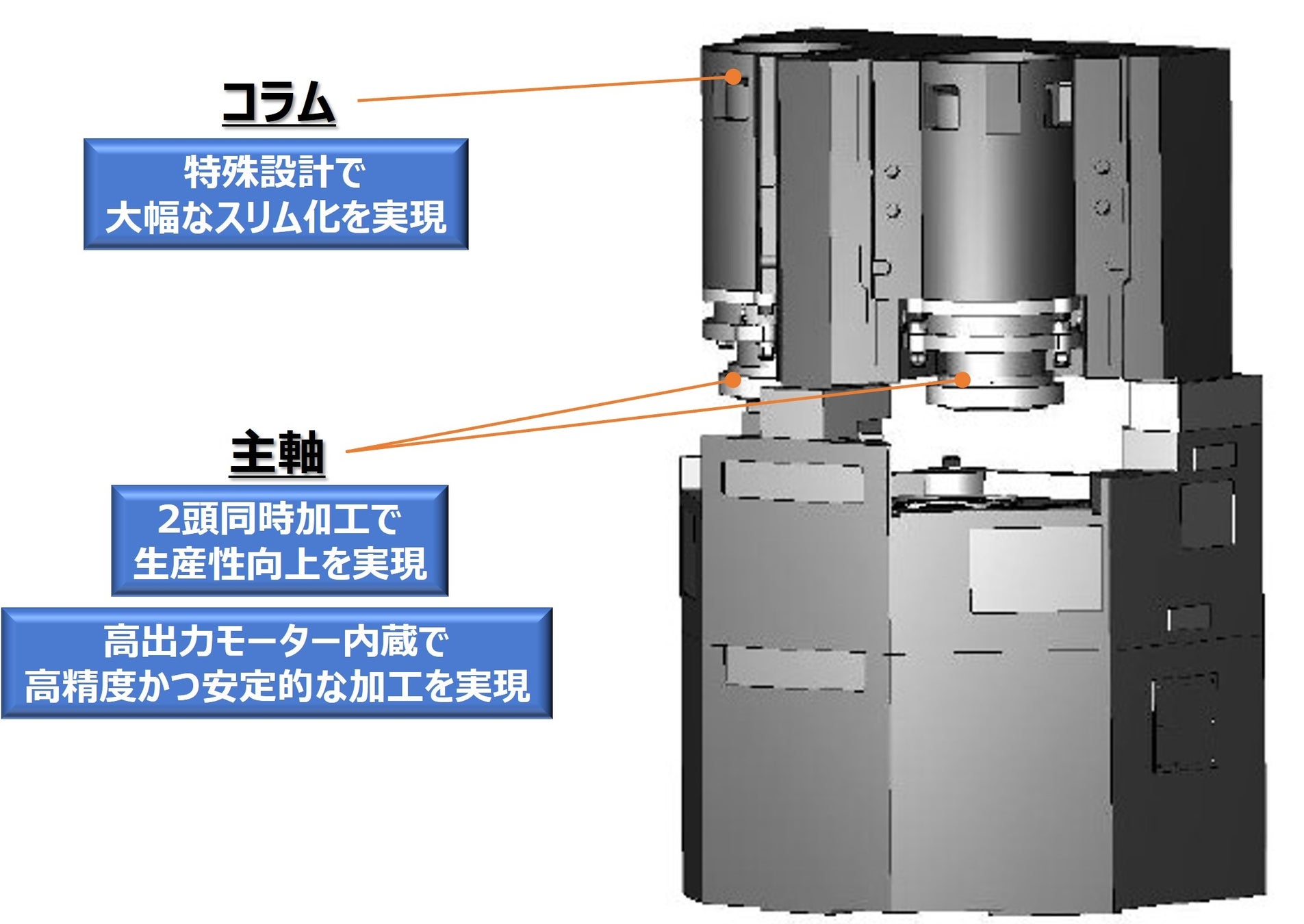 このたびジェイテクトマシンシステムが新たに開発した「DDT832」は、開発コンセプトを「POWERFUL & COMPACT」とし、2頭同時加工による時間短縮のみならず、主軸サイズアップによる高出力化や独自設計のコラム形状でスリム化を実現。半導体製造のお客様に、生産性向上や8インチ硬脆材料ウエハーの高精度加工、機械設置面積削減といったソリューションをご提供します。