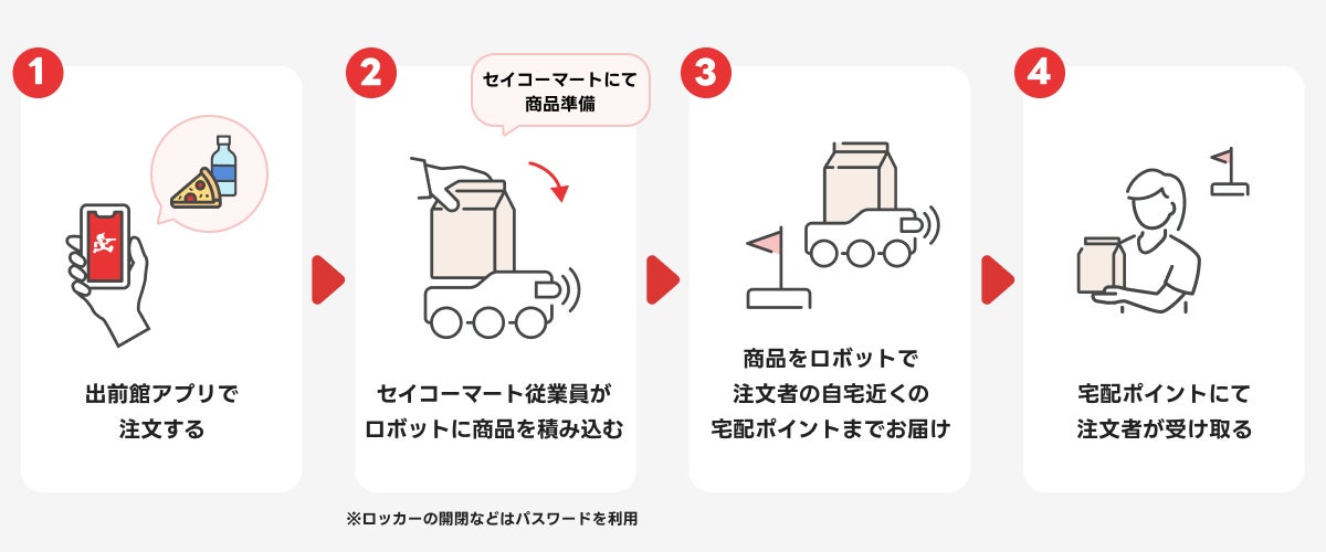 「出前館」アプリ、サイトより注文されたセイコーマートの商品を、無人自動配送ロボットにて自宅近くの宅配ポイントまで配送