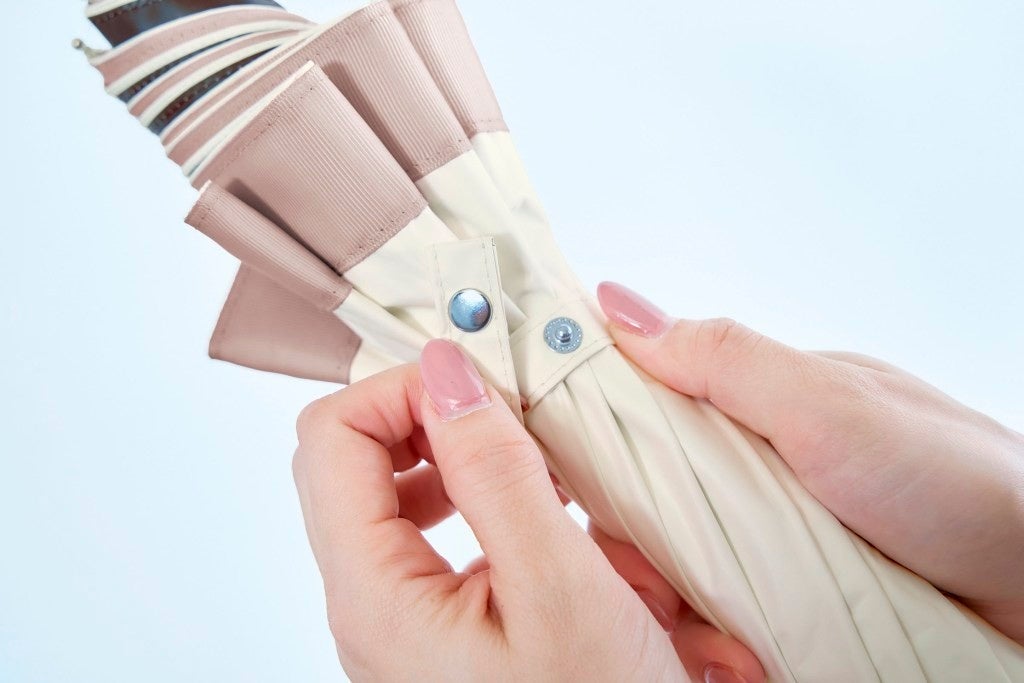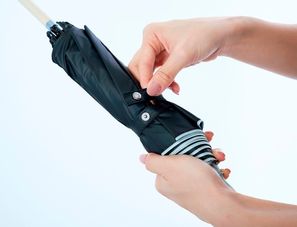 親骨を1本ずつ折り、中棒を縮めて内側のベルトをとめると、コンパクトに収納。すぐにサッと使いたい時は、親骨を折らずに外側のベルトをとめるだけなので、とっても便利。