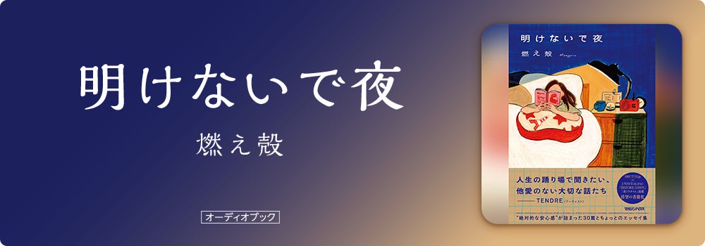 このたび、株式会社マガジンハウス(本社:東京都中央区、代表取締役社長:鉄尾周一)は、燃え殻『明けないで夜』のオーディオブックの配信を開始いたしました。本書は「BRUTUS.jp」と、ラジオ局J-WAVE(81.3FM)「BEFORE DAWN」の連動企画として約半年にわたって朗読連載してきた文章などを一冊にまとめたもので、昨年10月の発売から忽ち重版した話題作です。