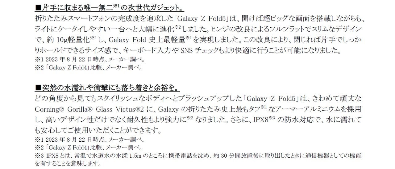 「Galaxy Z Flip5」および「Galaxy Z Fold5」の主な仕様および共通特長は、以下のとおりです。