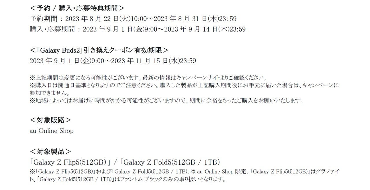対象期間中にau Online Shopにて、「Galaxy Z Flip5(512GB)」または「Galaxy Z Fold5(512GB / 1TB)」をご予約・ご購入・ご応募いただいたお客様全員に、各機種の差額相当の「au PAY ギフトカード」をプレゼントおよび、Samsungオンラインショップ( https://www.samsung.com/jp/offer/ )でご使用いただける「Galaxy Buds2」引き換えクーポンをプレゼント